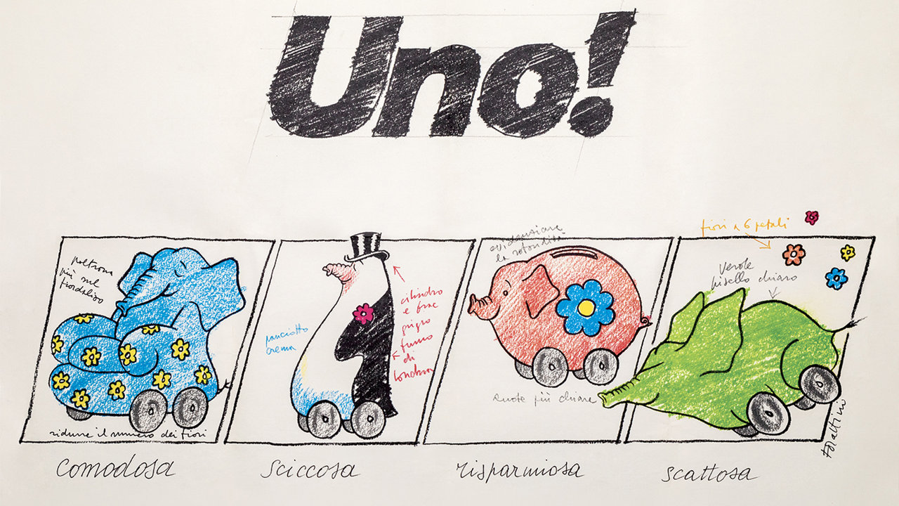 Δημιουργώντας τέσσερις συμπαθείς χαρακτήρες, δύο ελέφαντες, έναν πιγκουίνο και ένα γουρουνάκι-κουμπαρά, ο Forattini βρήκε τον πλέον ευρηματικό τρόπο για να επικοινωνήσει τα πλεονεκτήματα του Uno. Ο πρώτος ελέφαντας εξέφραζε την κορυφαία άνεση που προσέφερε το μοντέλο, ο πιγκουίνος την κομψότητα του, το γουρουνάκι την οικονομία και το δεύτερο ελεφαντάκι το δυναμικό χαρακτήρα του Uno.