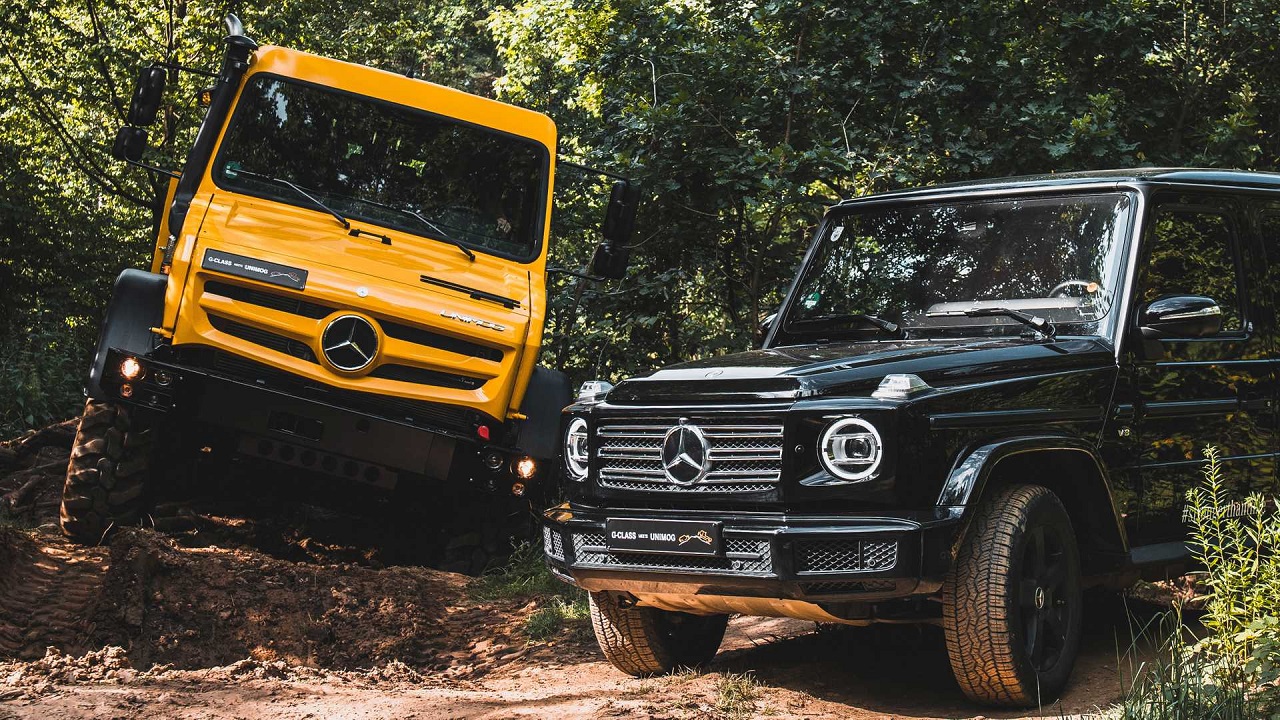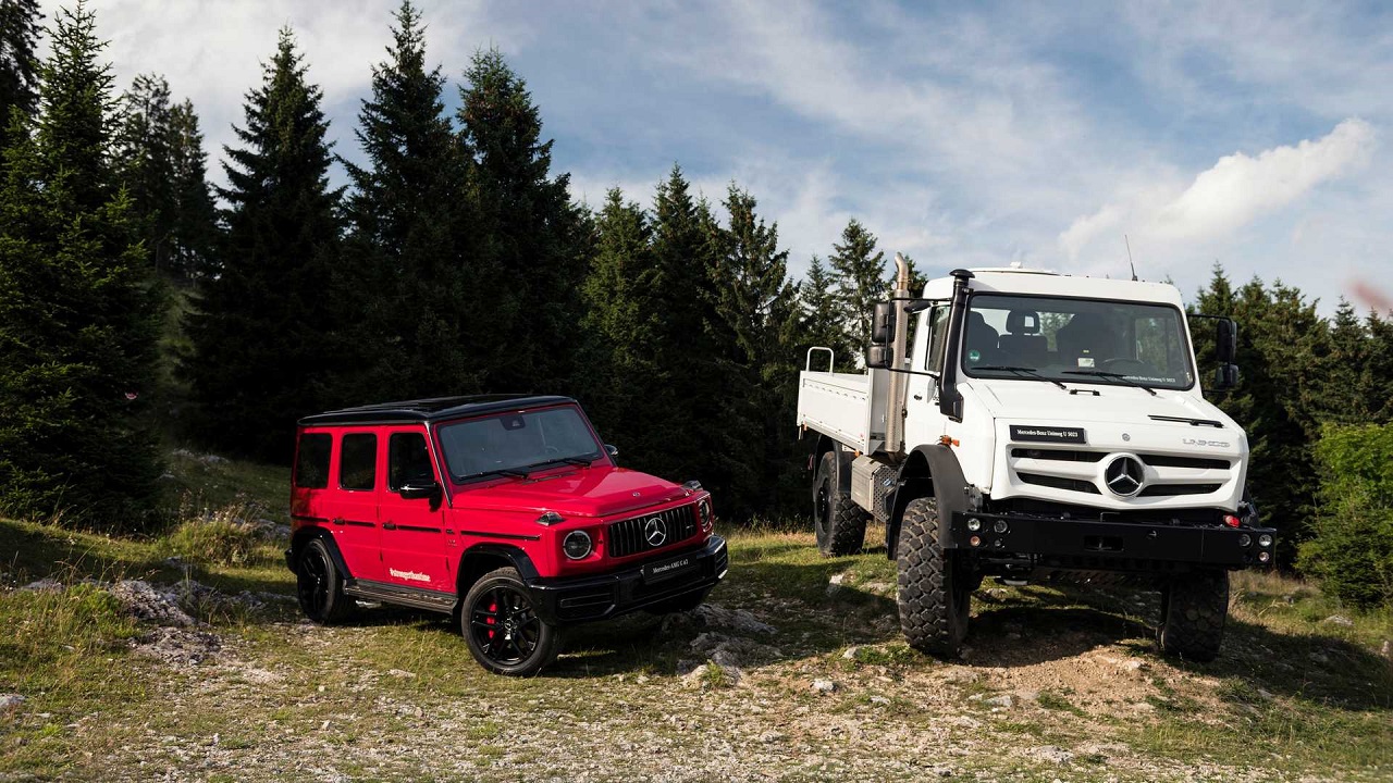 To όχημα που βλέπετε δίπλα στη G-Class είναι το εντυπωσιακό Unimog, του οποίου η ιστορία ξεκινά πίσω στο 1946. Συνολικά έχει κατασκευαστεί σε 350.000 αντίτυπα. Άξιο αναφοράς είναι και το ρεκόρ που έχει στο «βιογραφικό» του. Το Unimog έχει κατορθώσει να ανεβεί σε ψηλότερο σημείο από κάθε άλλο όχημα και πιο συγκεκριμένα στα 6.893 χιλιόμετρα, σε ηφαίστειο της Χιλής. Σκοπός της αποστολής ήταν να τοποθετηθούν ασύρματοι έκτακτης ανάγκης για τους ορειβάτες.