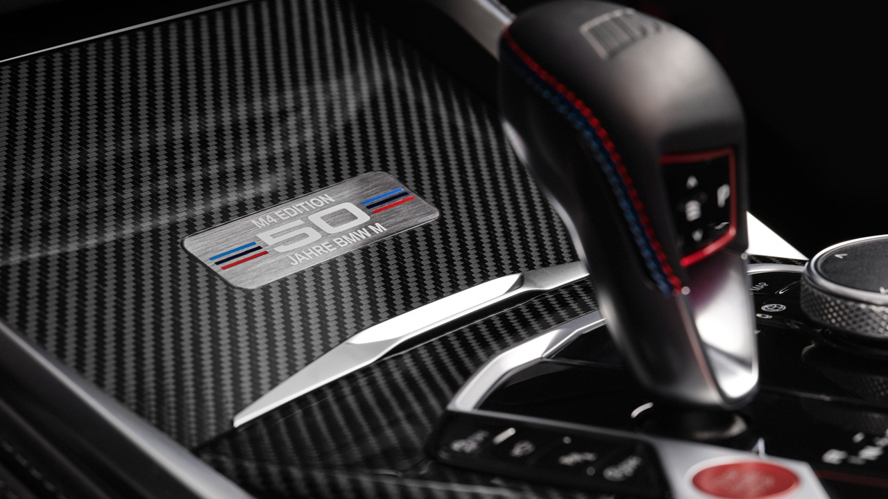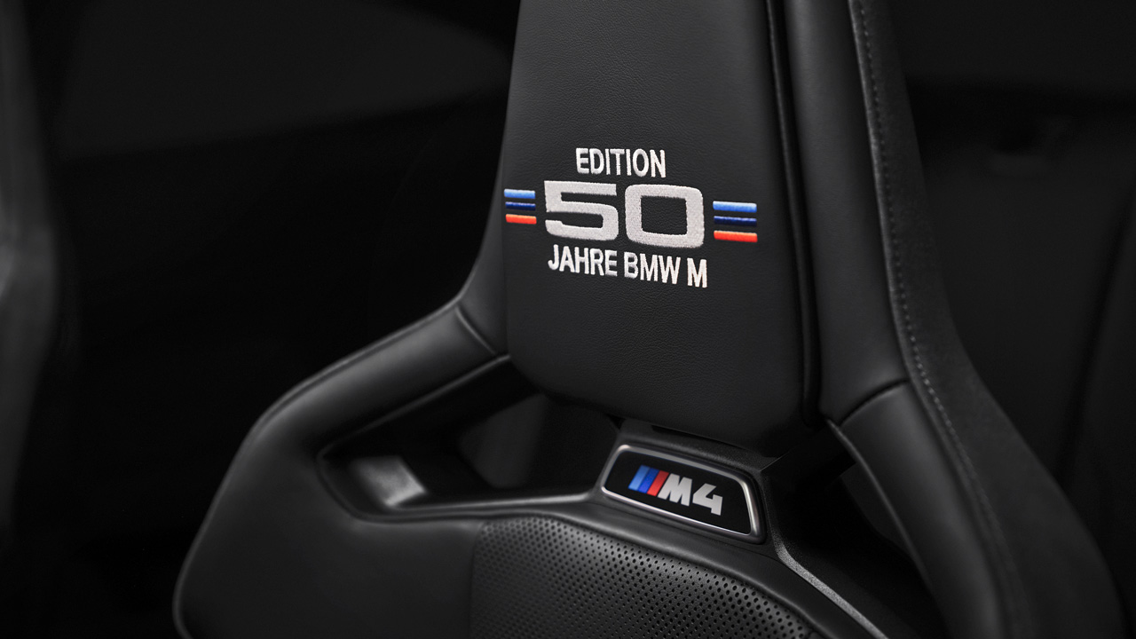 Περνώντας στο εσωτερικό βλέπουμε σε αρκετά σημεία της καμπίνας το σχετικό λογότυπο “Edition 50 Jahre BMW M”. Υπάρχει μία μεταλλική πινακίδα στην κεντρική κονσόλα, μία στα πλαϊνά μαρσπιέ, αλλά και στα προσκέφαλα των bucket καθισμάτων. Αξιοσημείωτο είναι το γεγονός ότι οι αγοραστές μπορούν προαιρετικά να επιλέξουν και τα πιο “σκληροπυρηνικά” carbon καθίσματα.