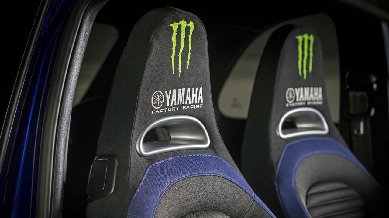Στο εσωτερικό νέα είναι τα σπορ καθίσματα σε μπλε απόχρωση που φέρουν το λογότυπο “Monster Energy Yamaha MotoGP” στα προσκέφαλα. Η ειδική αριθμημένη πλακέτα βρίσκεται στο τούνελ της μετάδοσης, ενώ μπλε στοιχεία ξεχωρίζουν πάνω στο μαύρο ταμπλό, συνεχίζοντας τη διχρωμία του αμαξώματος.
