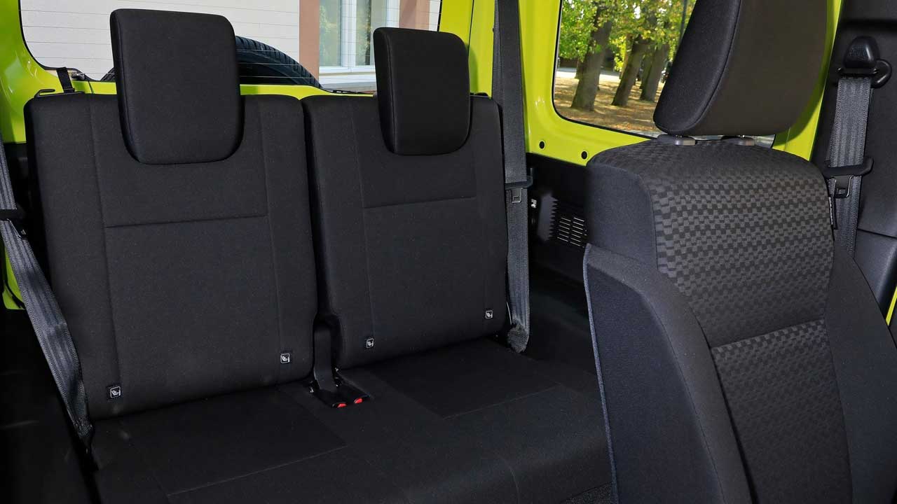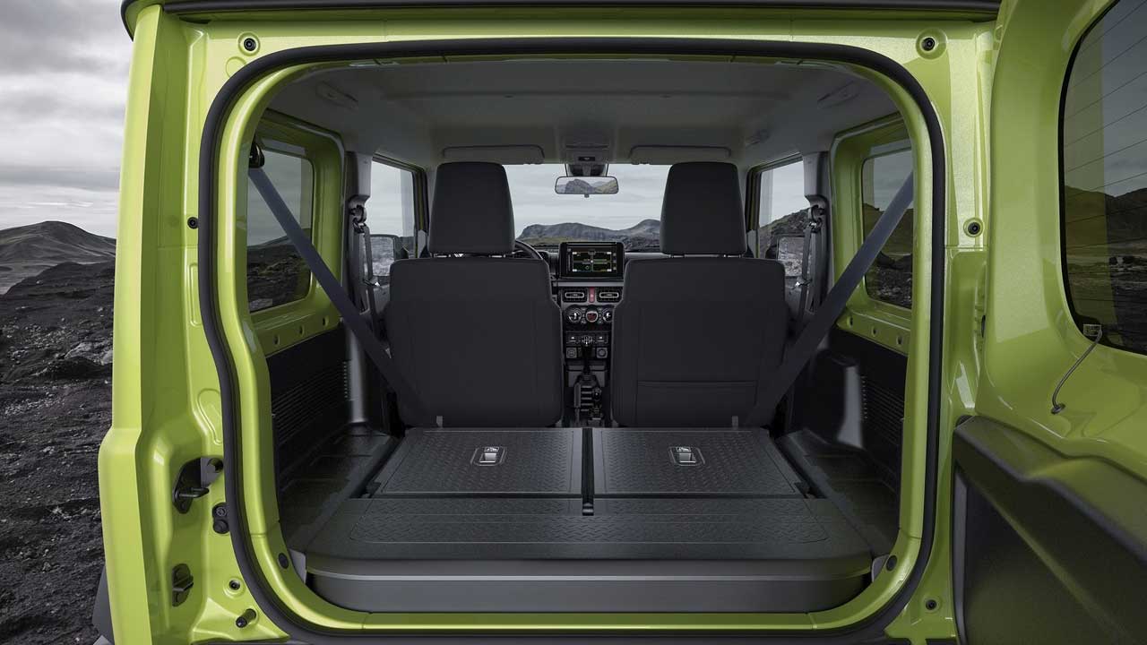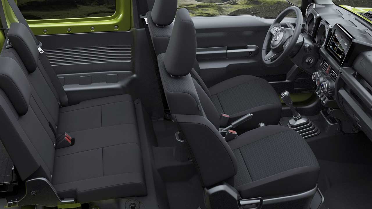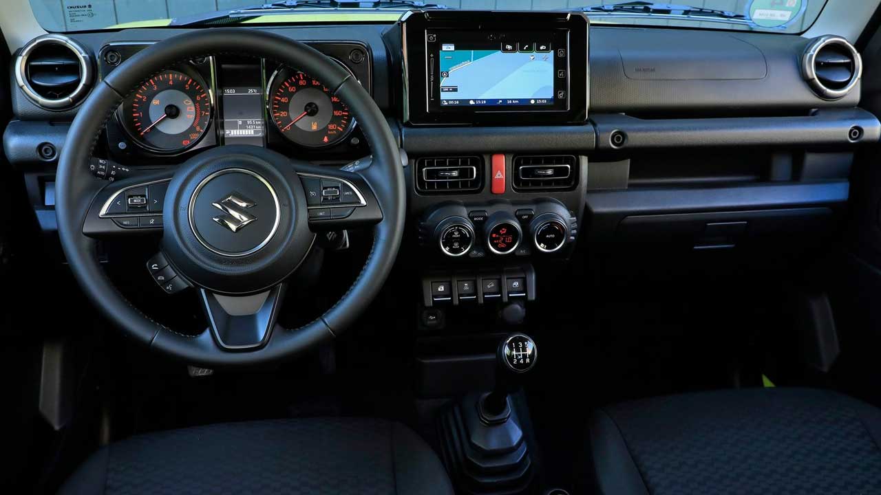 Προφανώς και το εσωτερικό του Suzuki Jimny έχει αλλάξει εντελώς σε σχέση με το μοντέλο που αντικαθιστά. Η εικόνα είναι πιο σύγχρονη, ενώ το ίδιο ισχύει και για τον εξοπλισμό του. Τα υλικά είναι σκληρά και με καλή συναρμογή, όπως πρέπει δηλαδή για ένα αυτοκίνητο που θέλει να φέρει τον τίτλο του εκτός δρόμου μοντέλου. Η εργονομία είναι σε καλό επίπεδο, με την πρακτικότητα να ακολουθεί. Το σύστημα πολυμέσων είναι εύκολο στην χρήση του, ενώ το ίδιο ισχύει και για τα χειριστήρια του κλιματισμού. Ο πίνακας οργάνων είναι ευανάγνωστος και πλήρης ενδείξεων και διαθέτει οθόνη για τις ενδείξεις του υπολογιστή ταξιδιού. Θα θέλαμε μεγαλύτερες τσέπες στις πόρτες, και τις ποτηροθήκες της κονσόλας δαπέδου πιο μπροστά τοποθετημένες. Τα καθίσματα είναι τοποθετημένα ψηλά και υπάρχει αρκετό φάρδος πλέον για τους επιβάτες, τόσο εμπρός όσο και πίσω. Η χωρητικότητα του πορτμπαγκάζ είναι μόλις στα 85 λίτρα αλλά με την αναδίπλωση των πίσω καθισμάτων (που έχουν και ρυθμιζόμενη κλίση πλάτης) φτάνει στα 377 λίτρα (φόρτωση μέχρι τα παράθυρα) και στα 830 λίτρα μέχρι την οροφή. Μάλιστα είναι καλυμμένος από σκληρό πλαστικό και επίπεδος, στοιχεία που εκτοξεύουν την πρακτικότητά του (από το ίδιο το πλαστικό είναι καλυμμένη και η πλάτη των καθισμάτων). Το άνοιγμα της πίσω πόρτας γίνεται στο πλάι (λόγω εξωτερικής ρεζέρβας) και προς τα δεξιά και απαιτεί αρκετό χώρο πίσω για να ανοίξει σε πλήρη έκταση.