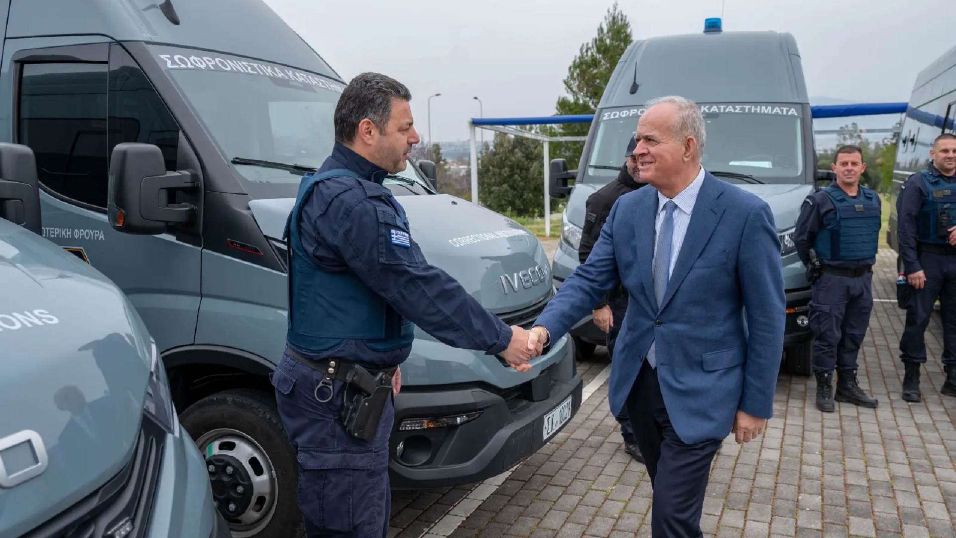 Η τελετή παράδοσης των μεταγωγικών οχημάτων, για τις υπηρεσιακές ανάγκες της Εξωτερικής Φρουράς των Σωφρονιστικών Καταστημάτων, πραγματοποιήθηκε την περασμένη Τρίτη 17 Μαρτίου 2026, παρουσία του Υφυπουργού Προστασίας του Πολίτη Ιωάννη Δ. Λαμπρόπουλου.