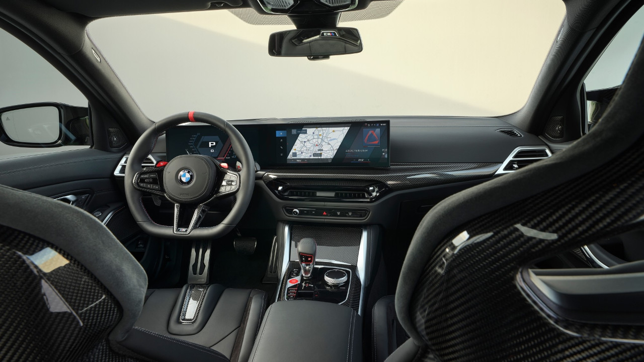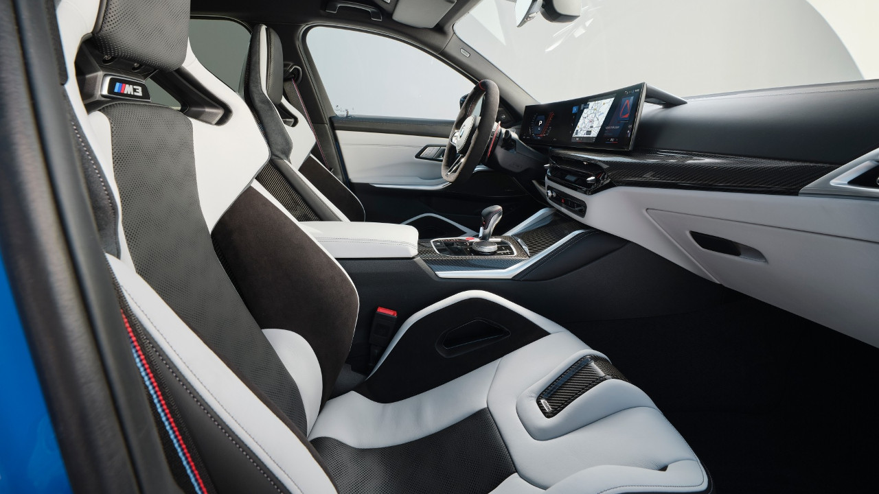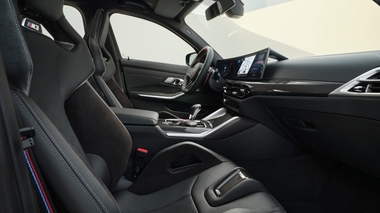 Αυτή είναι και η μοναδική σχεδιαστική εξωτερική αλλαγή σε σχέση με τη M3 που γνωρίζουμε μέχρι σήμερα, με την “δράση” να συνεχίζεται στην καμπίνα της M3. Εκεί βλέπουμε ένα νέο τιμόνι τριών ακτίνων, επίπεδο στο κάτω μέρος του, αλλά και νέα χειριστήρια για τον κλιματισμό που περιορίζουν ακόμη περισσότερο τα φυσικά κουμπιά.
