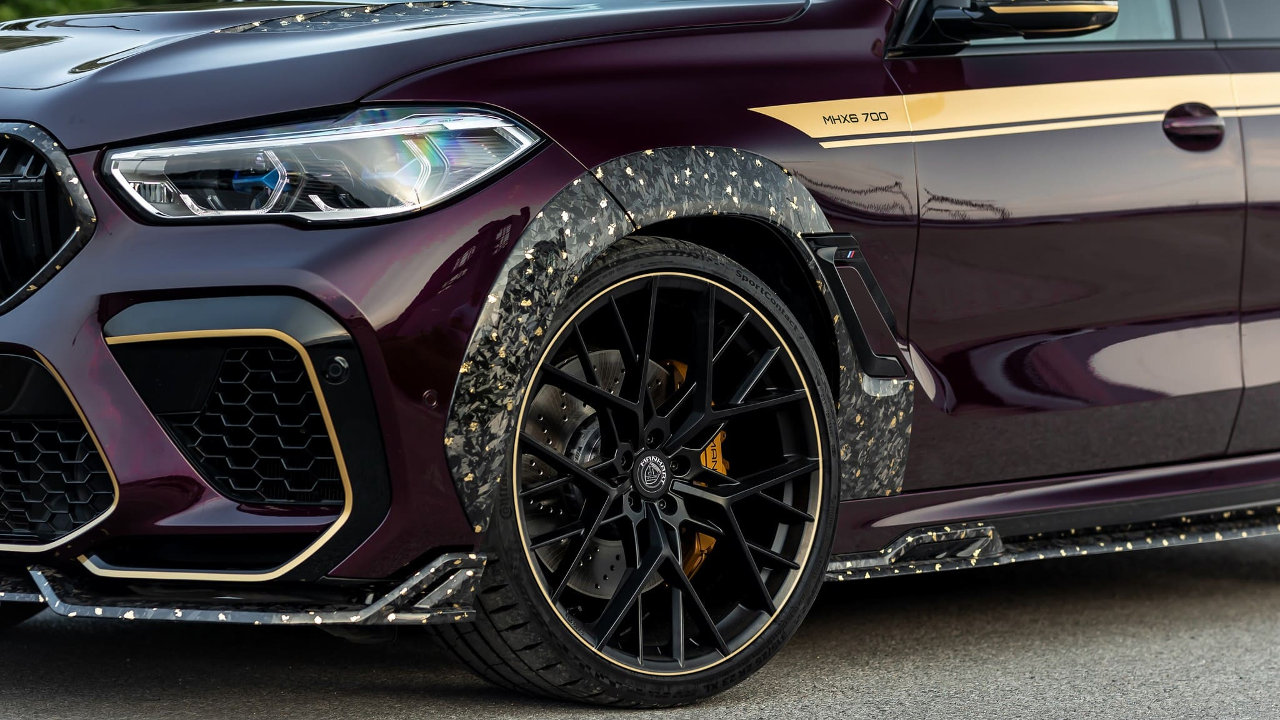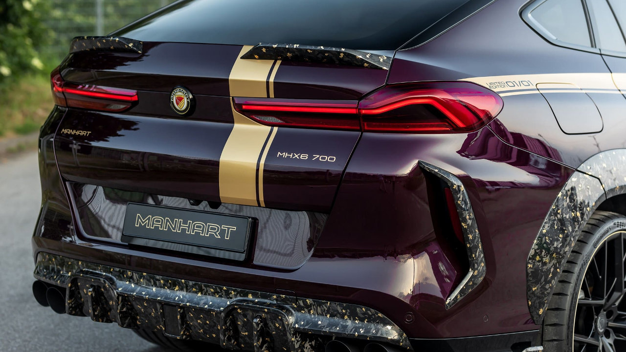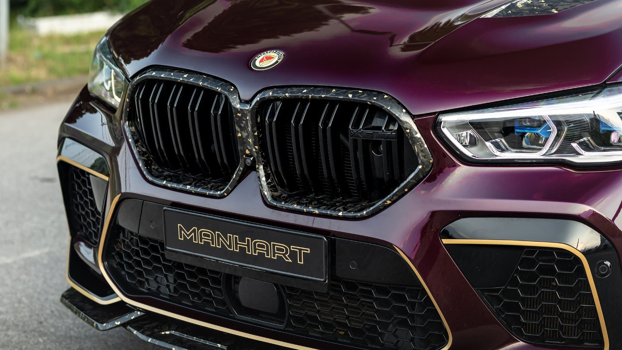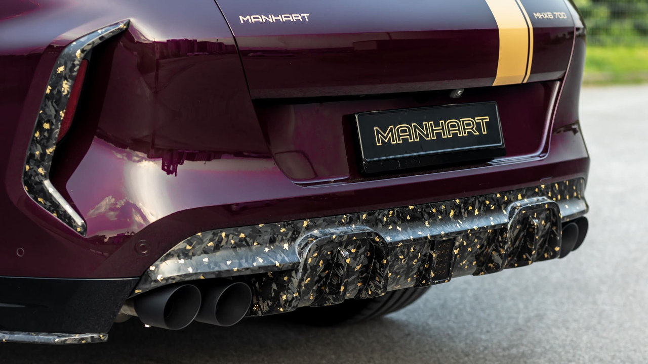 Το παραπάνω ισχύει για όλα τα κομμάτια του wide body kit της Manhart, το οποίο περιλαμβάνει το μερικώς βαμμένο καπό, τη μάσκα, τους θόλους των τροχών, το εμπρός σπόιλερ, τις πλαϊνές ποδιές και τον διαχύτη του προφυλακτήρα. Την ύπαρξη χρυσού τονίζουν οι μαύρες ματ “Classic Line” ζάντες των 23 ιντσών της Manhart, αλλά και το μελιτζανί χρώμα του αμαξώματος, σε συνδυασμό με τα νέα γραφικά.