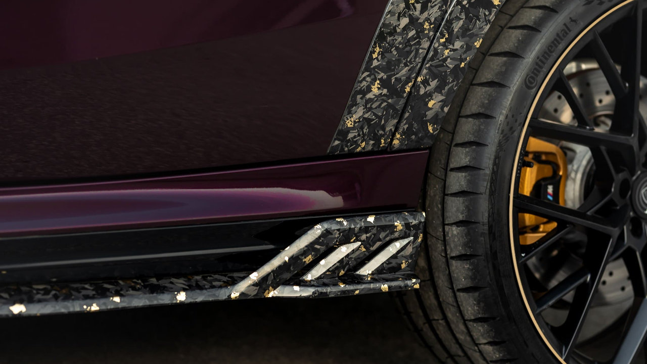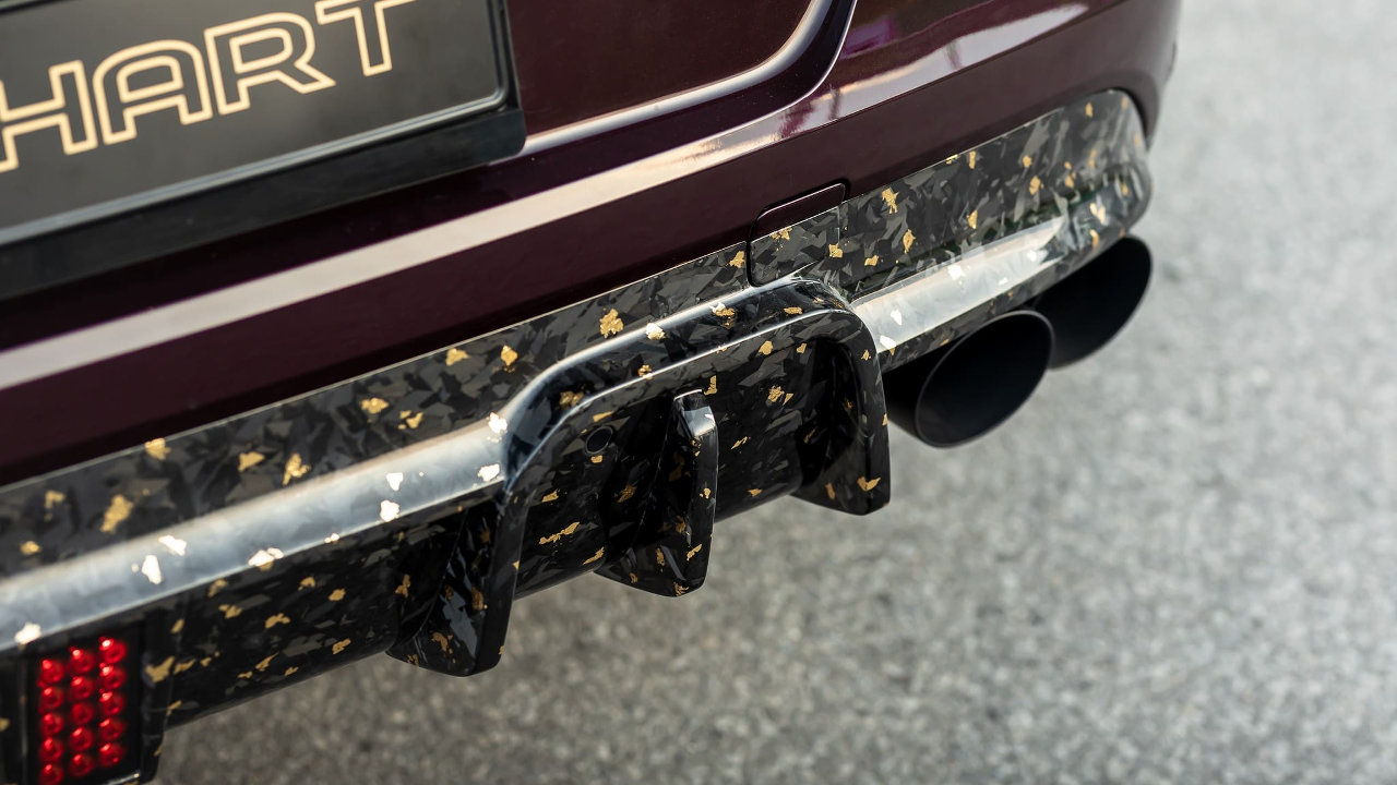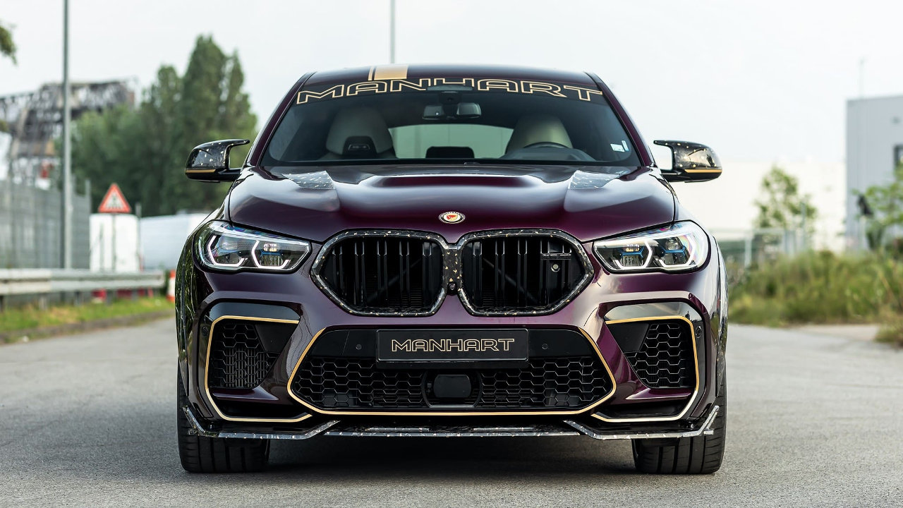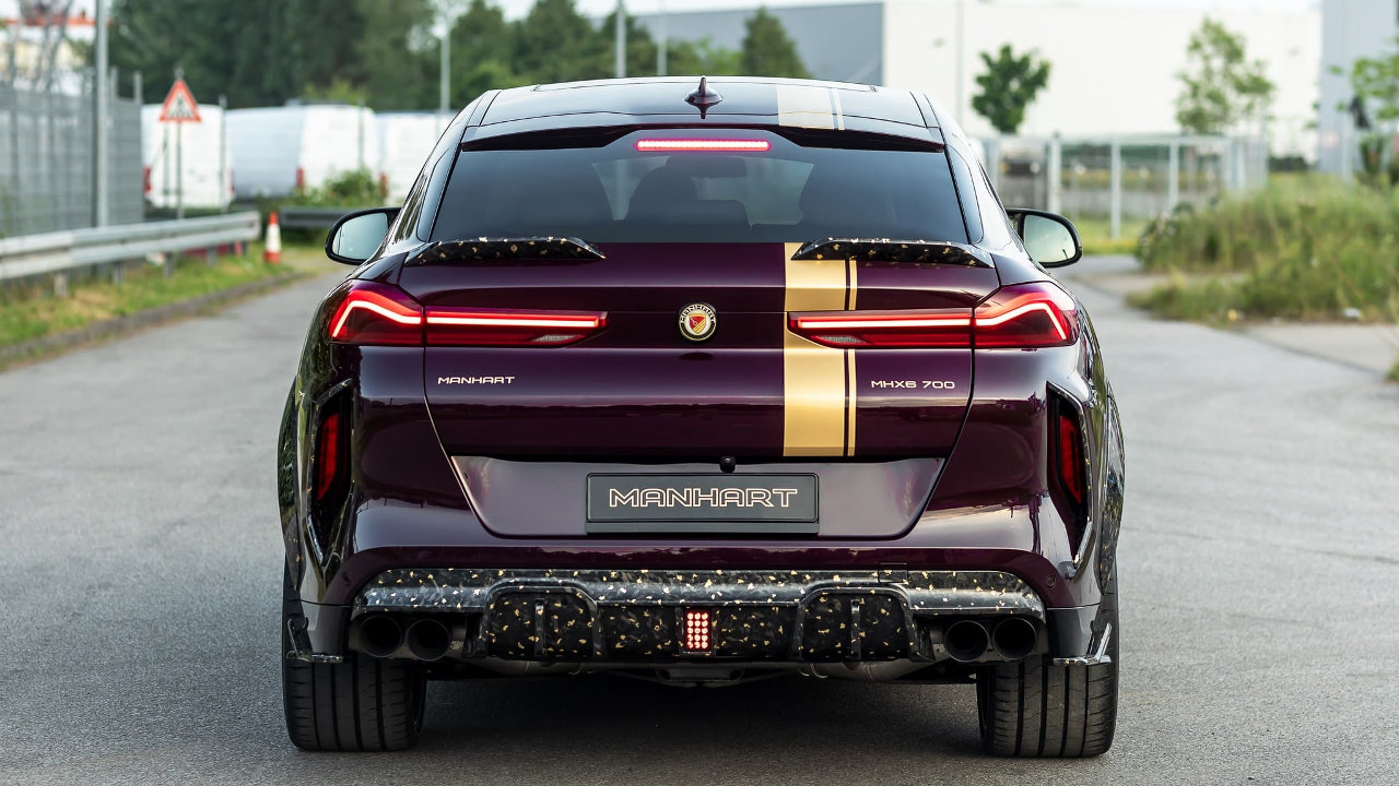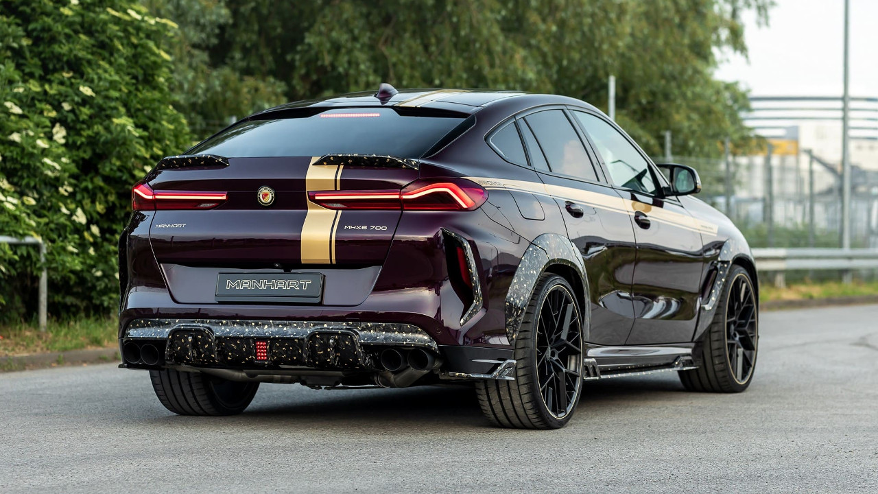 Το παραπάνω ισχύει για όλα τα κομμάτια του wide body kit της Manhart, το οποίο περιλαμβάνει το μερικώς βαμμένο καπό, τη μάσκα, τους θόλους των τροχών, το εμπρός σπόιλερ, τις πλαϊνές ποδιές και τον διαχύτη του προφυλακτήρα. Την ύπαρξη χρυσού τονίζουν οι μαύρες ματ “Classic Line” ζάντες των 23 ιντσών της Manhart, αλλά και το μελιτζανί χρώμα του αμαξώματος, σε συνδυασμό με τα νέα γραφικά.