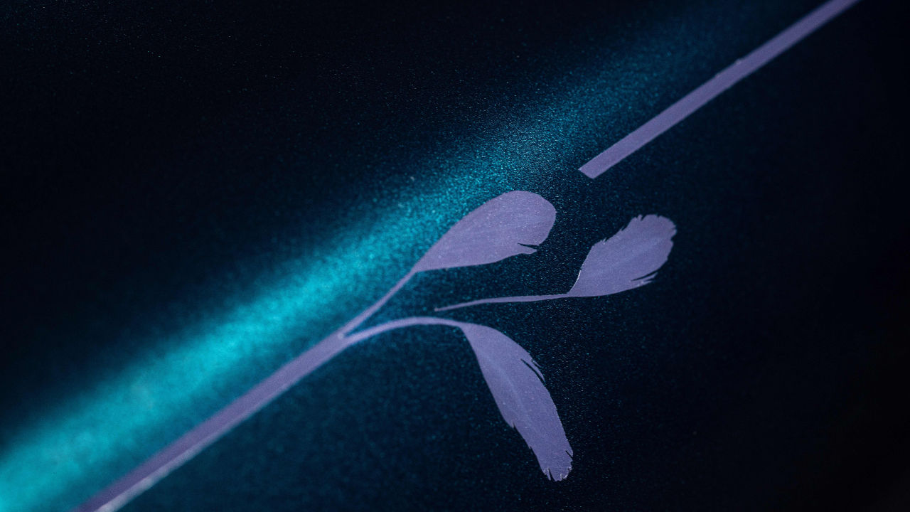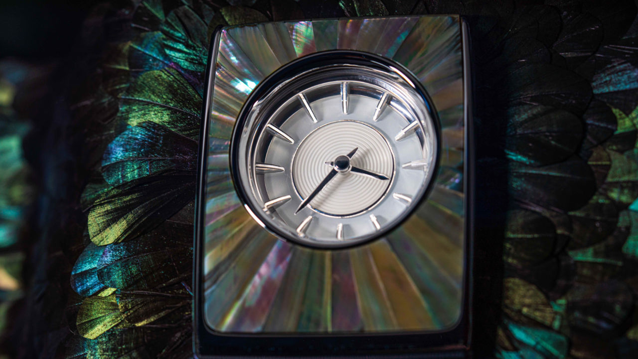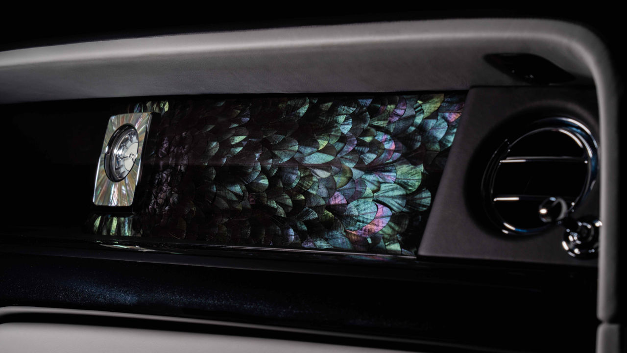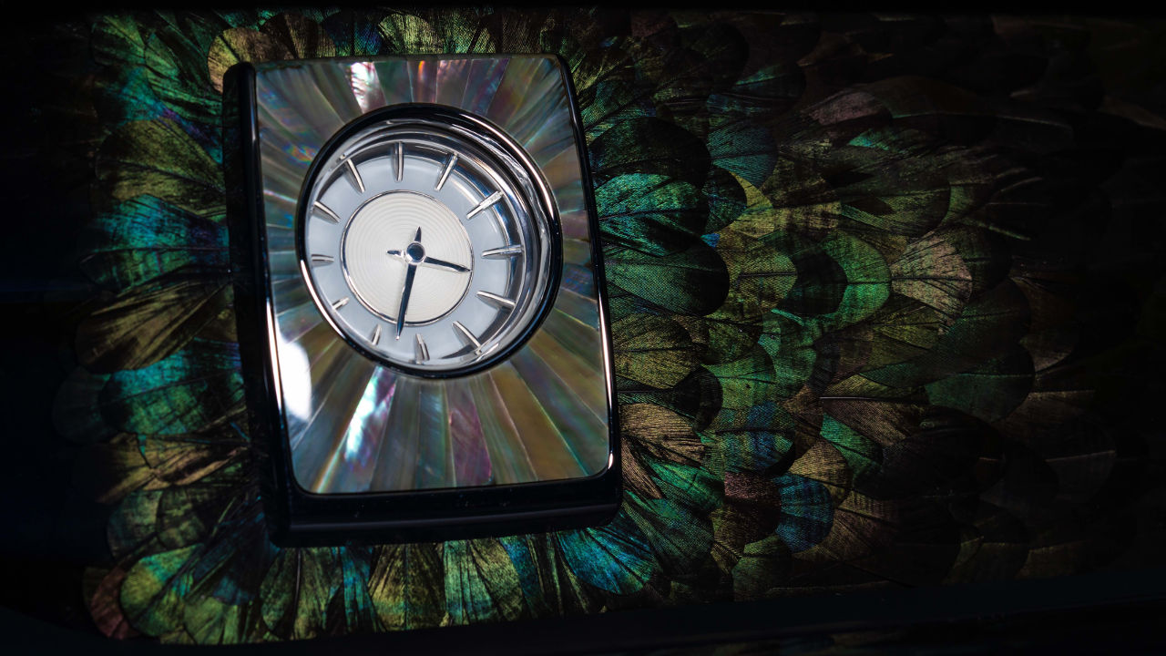 Πίσω λοιπόν από τη γυάλινη επιφάνεια βλέπουμε… ιριδίζοντα φτερά πουλιών που έχουν δουλευτεί στο χέρι, το καθένα ξεχωριστά ώστε να έχουν το σωστό σχήμα, σύμφωνο με τις επιθυμίες του καλλιτέχνη που δημιούργησε αυτό το έργο. Εξίσου εντυπωσιακό και ιριδίζον είναι και το φινίρισμα και πλαίσιο του ρολογιού στο ταμπλό, το οποίο κατέστη δυνατό με τη χρήση… κοχυλιών! Μέχρι σήμερα αυτά τα υλικά ήταν αδύνατο να εφαρμοστούν σε ένα ταμπλό αυτοκινήτου σύμφωνα με τους Βρετανούς.