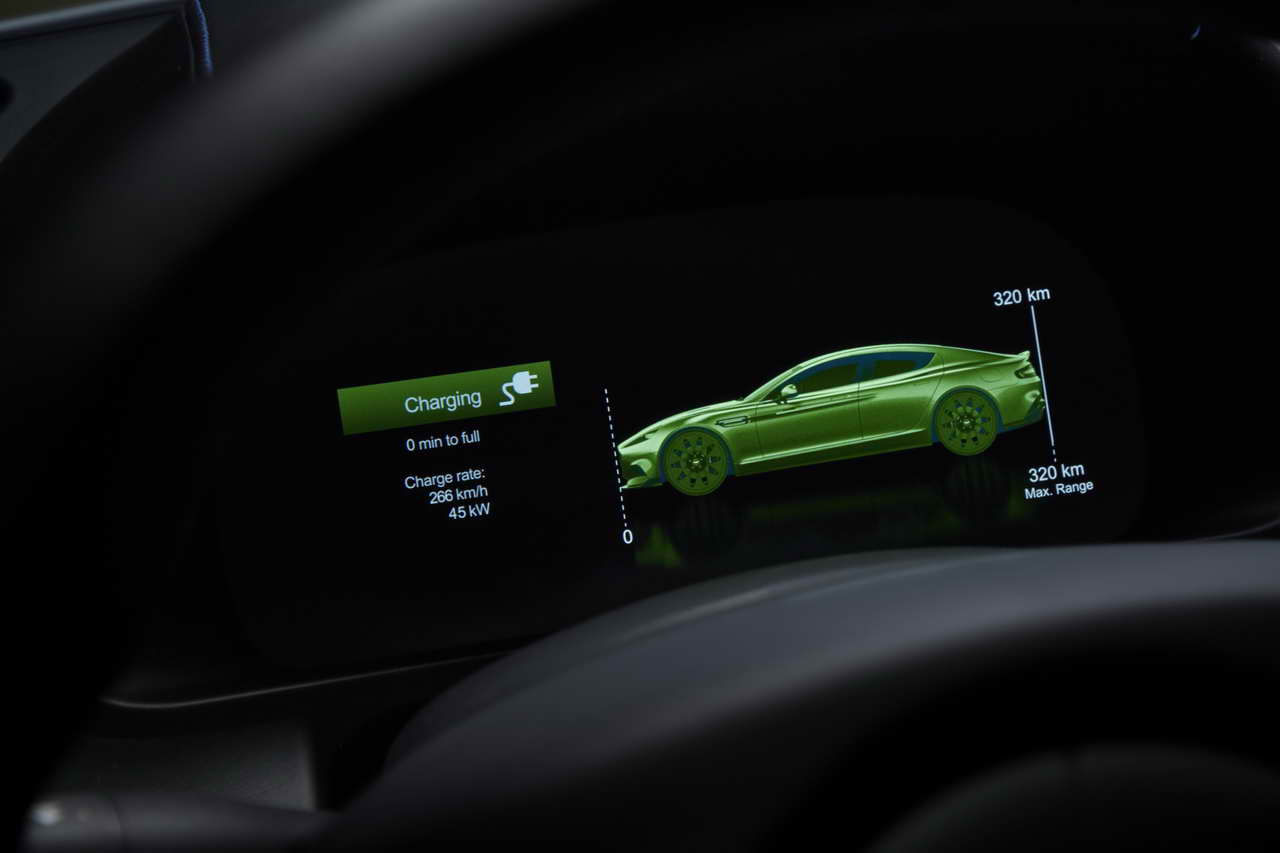 Στο πνεύμα της εξέλιξης κινούνται και οι αλλαγές στο εσωτερικό, με την ψηφιοποίηση να είναι φανερή στην Aston Martin Rapide E. Τα αναλογικά όργανα αντικαταστάθηκαν από μια ψηφιακή οθόνη 10 ιντσών που προσφέρει πληροφορίες στον οδηγό σε πραγματικό χρόνο κατά την κίνηση. Μεταξύ αυτών συγκαταλέγονται η κατάσταση φόρτισης της μπαταρίας, η κατανάλωση ενέργειας, η διαθέσιμη ισχύς του κινητήρα και η απόδοση του συστήματος ανάκτησης ενέργειας. Επιπλέον, χάρη στη χρήση μιας ειδικής εφαρμογής, ο οδηγός θα μπορεί να δει σημαντικά στοιχεία του αυτοκινήτου από μακριά.
