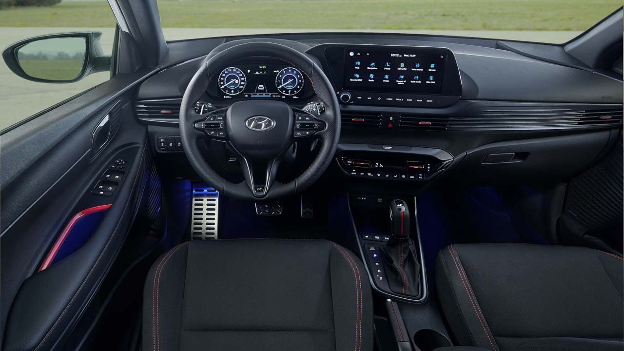 Στο εσωτερικό του το Hyundai i20 N Line έχει να επιδείξει μικροαλλαγές και κυρίως λεπτομέρειες όπως οι κόκκινες ραφές, τα πεντάλ αλουμινίου και το δέρμα σε τιμόνι και επιλογέα ταχυτήτων. Φυσικά δεν απουσιάζει και το σήμα N Line από το τιμόνι.