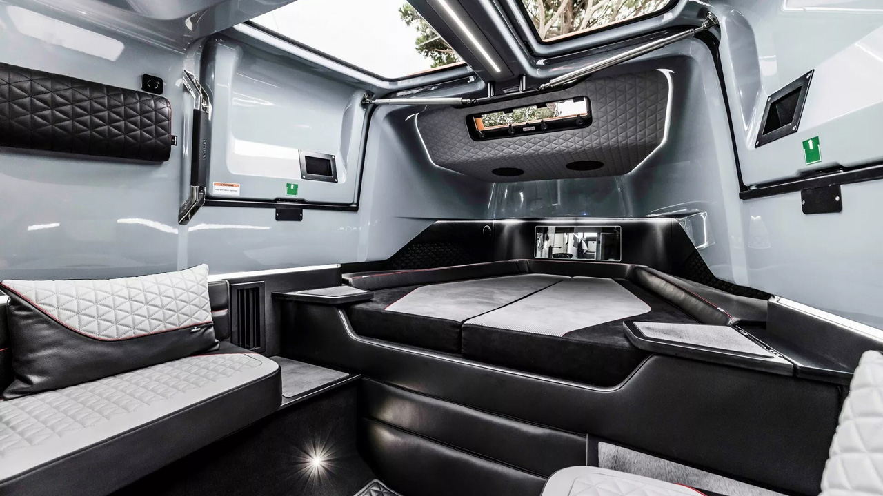 Πάμε στην εξωτερική του εμφάνιση, με το χρώμα της έκδοσης να ονομάζεται “Stealth Green” και να δημιουργεί μια όμορφη αντίθεση με τα μπεζ καθίσματα. Εκεί μπορούν να βολευτούν 7 επιβάτες, ενώ για τις πολυήμερες εξορμήσεις υπάρχει και καμπίνα με διπλό κρεβάτι. Η τελευταία είναι άκρως πολυτελείς, μιας και φέρει επενδύσεις από ανθρακονήματα, σύστημα κλιματισμού, τροφοδοσία πόσιμου νερού και πολλές ακόμη ανέσεις.