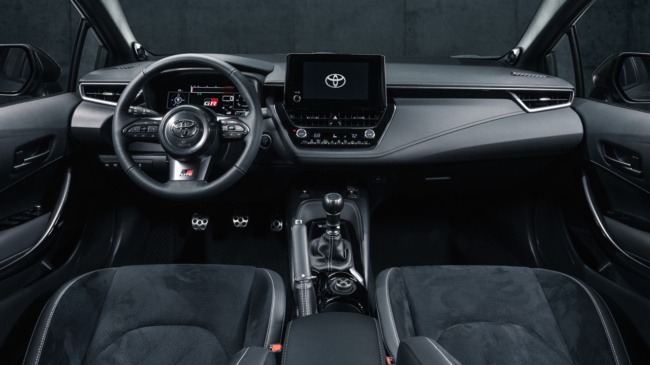 Παρόμοια φιλοσοφία επικρατεί και στο εσωτερικό, εκεί όπου οι πιο “παραδοσιακοί” της αυτοκίνησης θα ενθουσιαστούν με το χειροκίνητο κιβώτιο και το μηχανικό χειρόφρενο, ενώ ακριβώς δίπλα υπάρχει περιστροφικός διακόπτης για την επιλογή του προγράμματος οδήγησης. Επιπλέον “sportive” στοιχεία αποτελούν τα αλουμινένια πεντάλ, τα καθίσματα με έντονη πλευρική στήριξη και τα λογότυπα “GR” σε αρκετά σημεία της καμπίνας. Ασφαλώς το περιβάλλον είναι και αρκετά σύγχρονο, με την κεντρική οθόνη αφής “Toyota Audio Multimedia system” να έχει μέγεθος 8 ιντσών, ενώ πίσω από το τιμόνι υπάρχει οθόνη σε ρόλο πίνακα οργάνων 12,3 ιντσών, η οποία εκτός των άλλων φέρει live ενδείξεις θερμοκρασιών και πίεσης turbo.