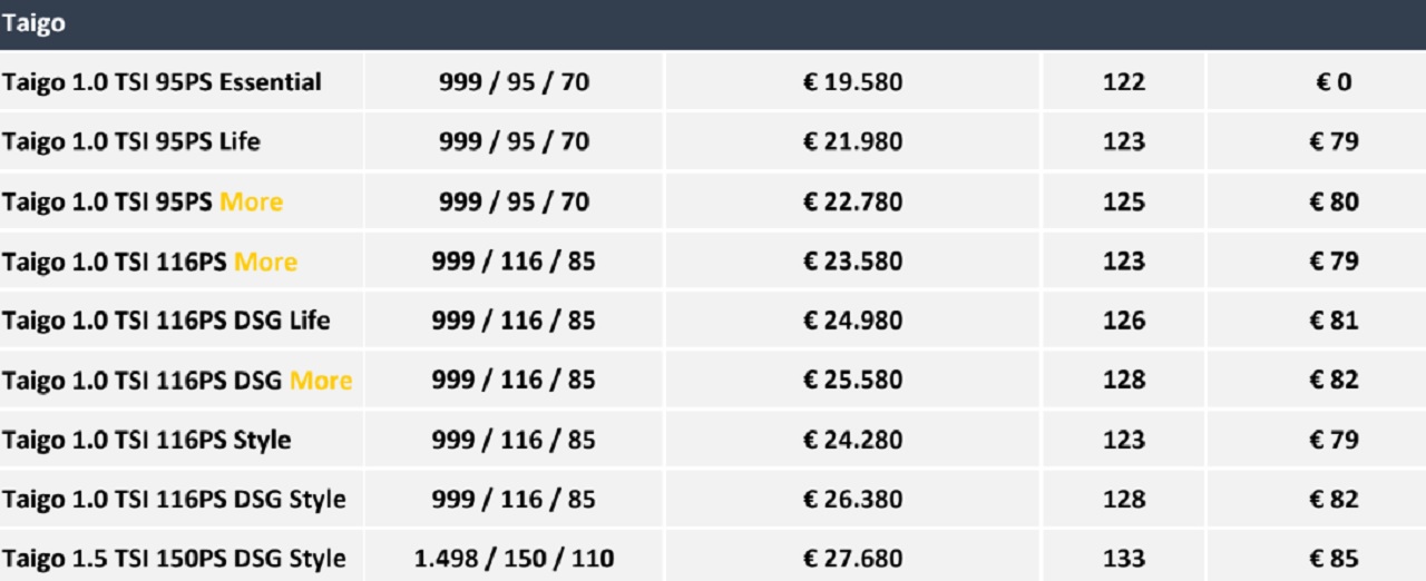Ακολουθούν οι τιμές του VW Taigo όπως αναγράφονται στο νέο τιμοκατάλογο που τέθηκε σε ισχύ από τις 4/3. Στην τελευταία στήλη αναγράφονται τα ποσά των τελών κυκλοφορίας της κάθε έκδοσης.