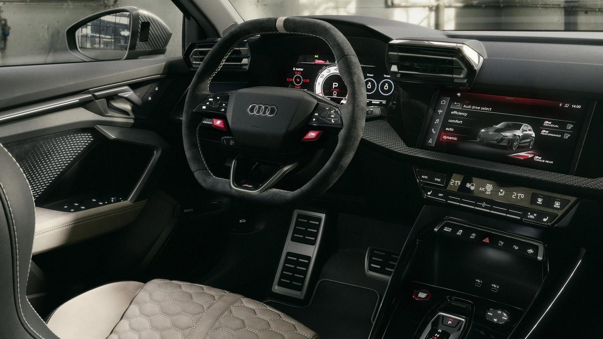 Στο εσωτερικό υπάρχουν επίσης στοιχεία που δείχνουν ότι πρόκειται για περιορισμένη έκδοση. Τα καθίσματα είναι τύπου bucket με επένδυση Dinamica και λεπτομέρειες σε χρώμα Neodymium gold. Υπάρχουν επίσης ειδικά γραφικά στον ψηφιακό πίνακα οργάνων, που θυμίζουν το Audi RS2 Avant, το πρώτο μοντέλο RS της Audi. Η έκδοση διαθέτει επίσης αριθμημένη πλακέτα στην κεντρική κονσόλα που δείχνει τη σειρά παραγωγής του κάθε αυτοκινήτου.