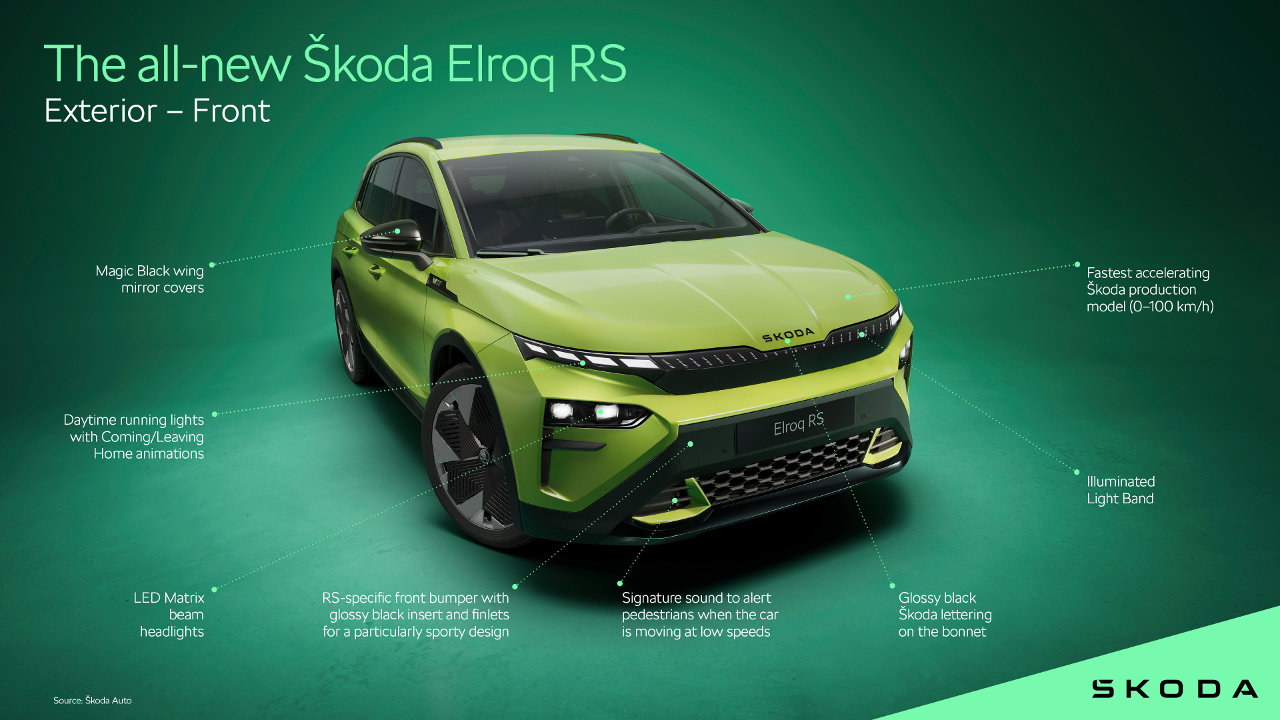 Το Elroq RS έχει ηλεκτρική αυτονομία άνω των 550 χιλιομέτρων στον κύκλο WLTP, ειδικά διακοσμητικά RS και πλούσιο βασικό εξοπλισμό. Είναι επίσης το μοντέλο με την πιο γρήγορη επιτάχυνση στην τρέχουσα γκάμα μοντέλων της Skoda, επιτυγχάνοντας το 0-100 km/h σε 5,4 δευτερόλεπτα, ενώ η τελική ταχύτητα είναι 180 χλμ./ώρα.