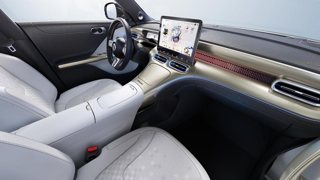 Το εσωτερικό του είναι λιτό και high tech, όπως άλλωστε επιτάσσει η εποχή, ενώ διαθέτει σχεδιαστικά στοιχεία που παραπέμπουν σε Mercedes, όπως οι αεραγωγοί και η κεντρική κονσόλα. Διαθέτει μία ψηφιακή οθόνη πίσω από το τιμόνι σε θέση πίνακα οργάνων, η οποία έχει διαγώνιο 9,2 ίντσες, ενώ στο κέντρο του ταμπλό συναντάμε την οθόνη αφής του συστήματος πολυμέσων 12,8 ιντσών. Το πίσω κάθισμα θα είναι διαιρούμενο και συρόμενο και το πορτμπαγκάζ θα μπορεί να αυξομειωθεί από τα 273 έως τα 411 λίτρα.