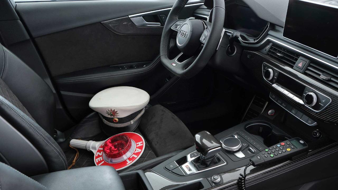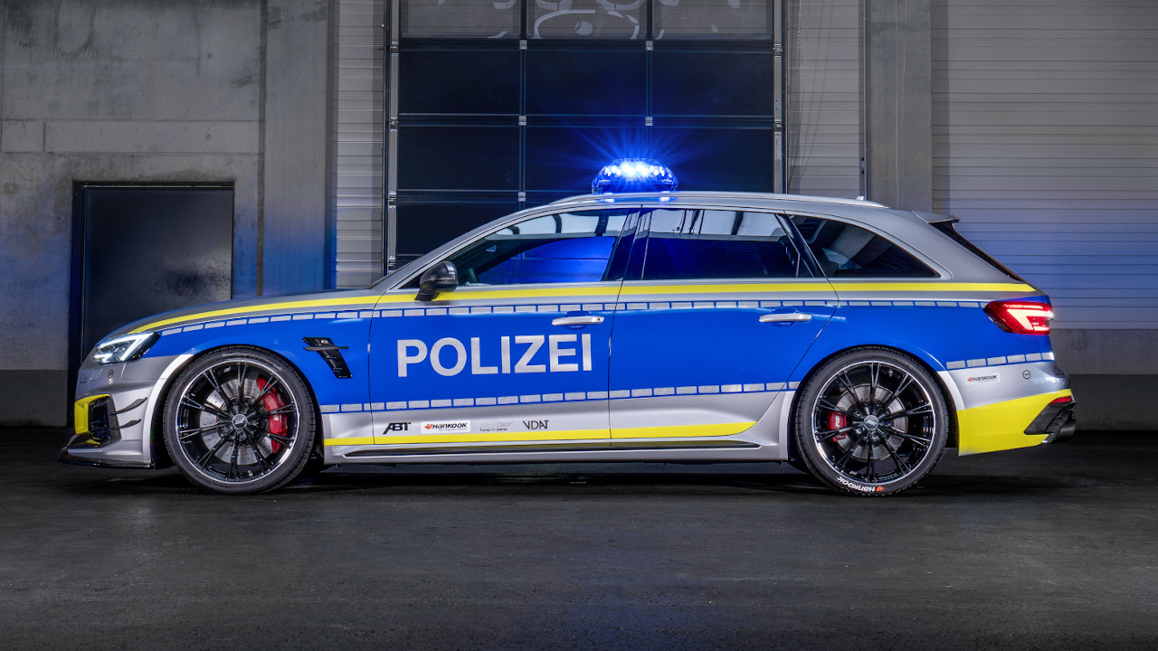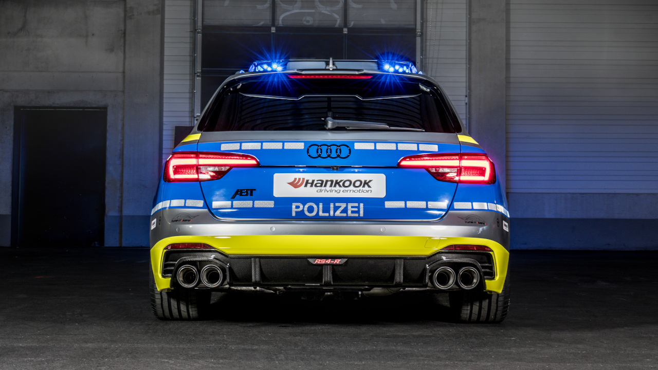 Εξωτερικά το ήδη εντυπωσιακό RS4-R έχει αποκτήσει μια έξτρα δόση… σεβασμού, που δεν πηγάζει μόνο από τα επίσημα αυτοκόλλητα, γραφικά, φάρους και σειρήνες της γερμανικής αστυνομίας. Η ABT ασχολήθηκε περαιτέρω με το παρουσιαστικό του τοποθετώντας αεροδυναμικά βοηθήματα στον εμπρός προφυλακτήρα, διαφορετική γρίλια στη μάσκα, αεραγωγούς στους θόλους αλλά και διαφορετικό διαχύτη από ανθρακονήματα πίσω που περιβάλει τις διπλές απολήξεις της νέας εξάτμισης.