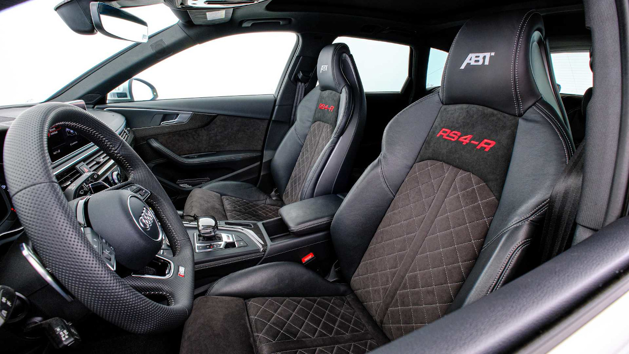 Ανάλογες είναι οι αλλαγές και στο εσωτερικό του RS4-R. Νέα πατάκια που φέρουν το λογότυπο του μοντέλου, επιλογέας με το σήμα της ABT από ανθρακονήματα, διάφορα σήματα της εταιρίας, αλλά και φωτισμός με το σήμα του μοντέλου της Audi είναι οι κύριες αλλαγές που κάνουν τη διαφορά. Διαφορετικές είναι και οι επενδύσεις των ήμι-δερμάτινων καθισμάτων που φέρουν επίσης τα σήματα της εταιρίας και του μοντέλου.