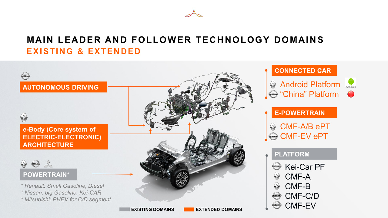Διαμοιρασμός των “ευθυνών” βάσει του πλάνου “leader-follower” θα υπάρξει και στο κομμάτι των τεχνολογιών με κάθε εταιρία να εστιάζει στα δυνατά της σημεία. Έτσι η Nissan θα αναλάβει το κύριο βάρος για την εξέλιξη των συστημάτων αυτόνομης οδήγησης και η Renault θα δώσει προτεραιότητα στις τεχνολογίες συνδεσιμότητας και στις πλατφόρμες με λειτουργικό Android.