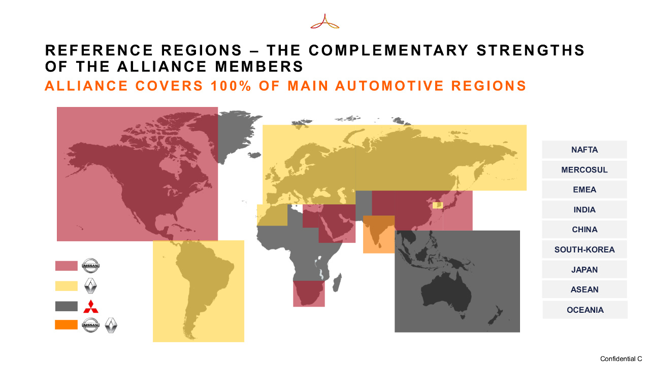 Υπό το νέο πλάνο η Nissan αναλαμβάνει ηγετικό ρόλο στις αγορές της Β.Αμερικής, της Κίνας και της Ιαπωνίας. Από την πλευρά της η Renault εστιάζει σε Ευρώπη, Ρωσία και Ν. Αμερική, ενώ η Mitsubishi στις χώρες της Ν.Α. Ασίας (Βιετνάμ, Ινδονησία, Καμπότζη, Λάος, Μαλαισία, Μπρουνέι, Μιανμάρ, Σιγκαπούρη, Ταϊλάνδη, Φιλιππίνες) και σε εκείνες της Ωκεανίας, με μεγαλύτερο “εκπρόσωπό” τους την Αυστραλία.