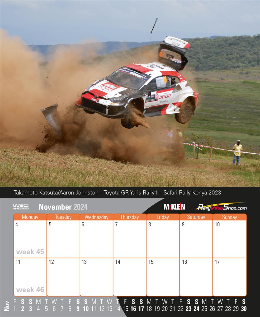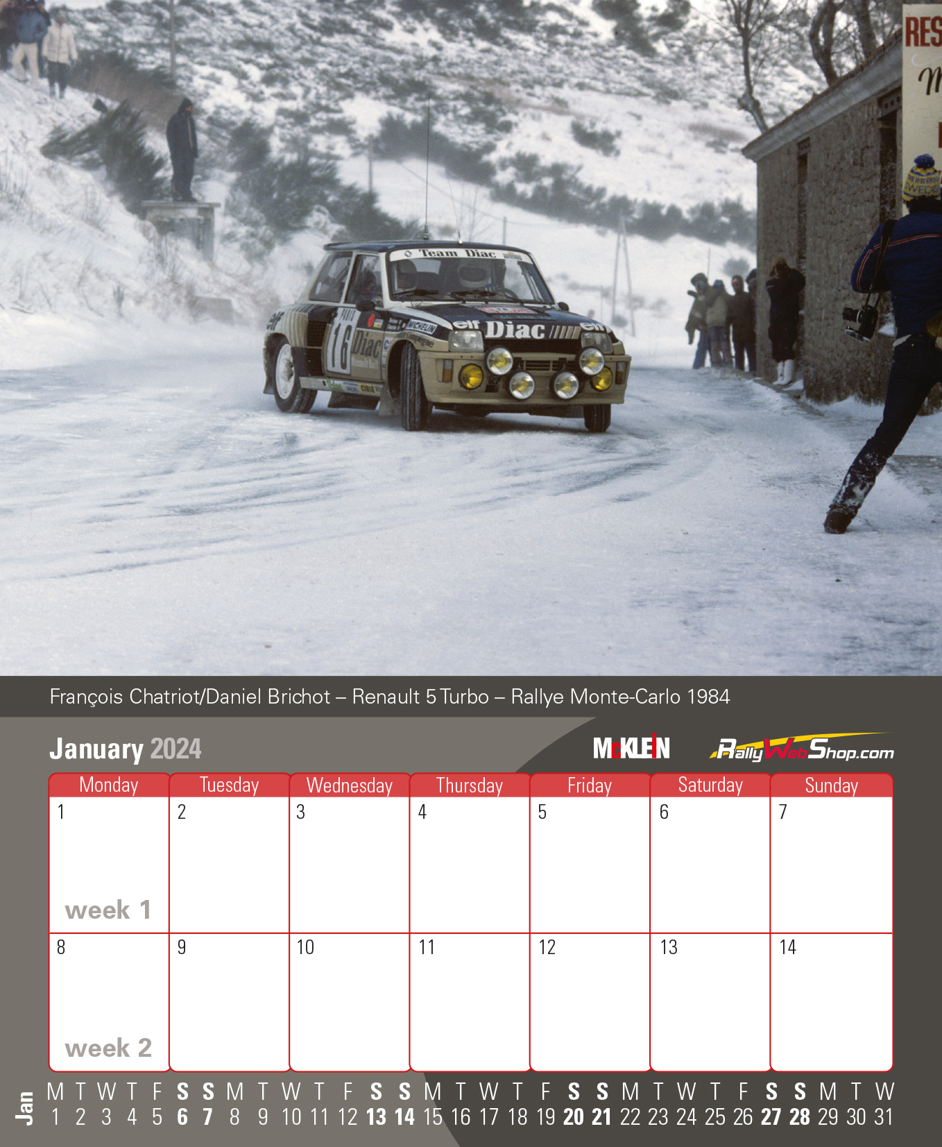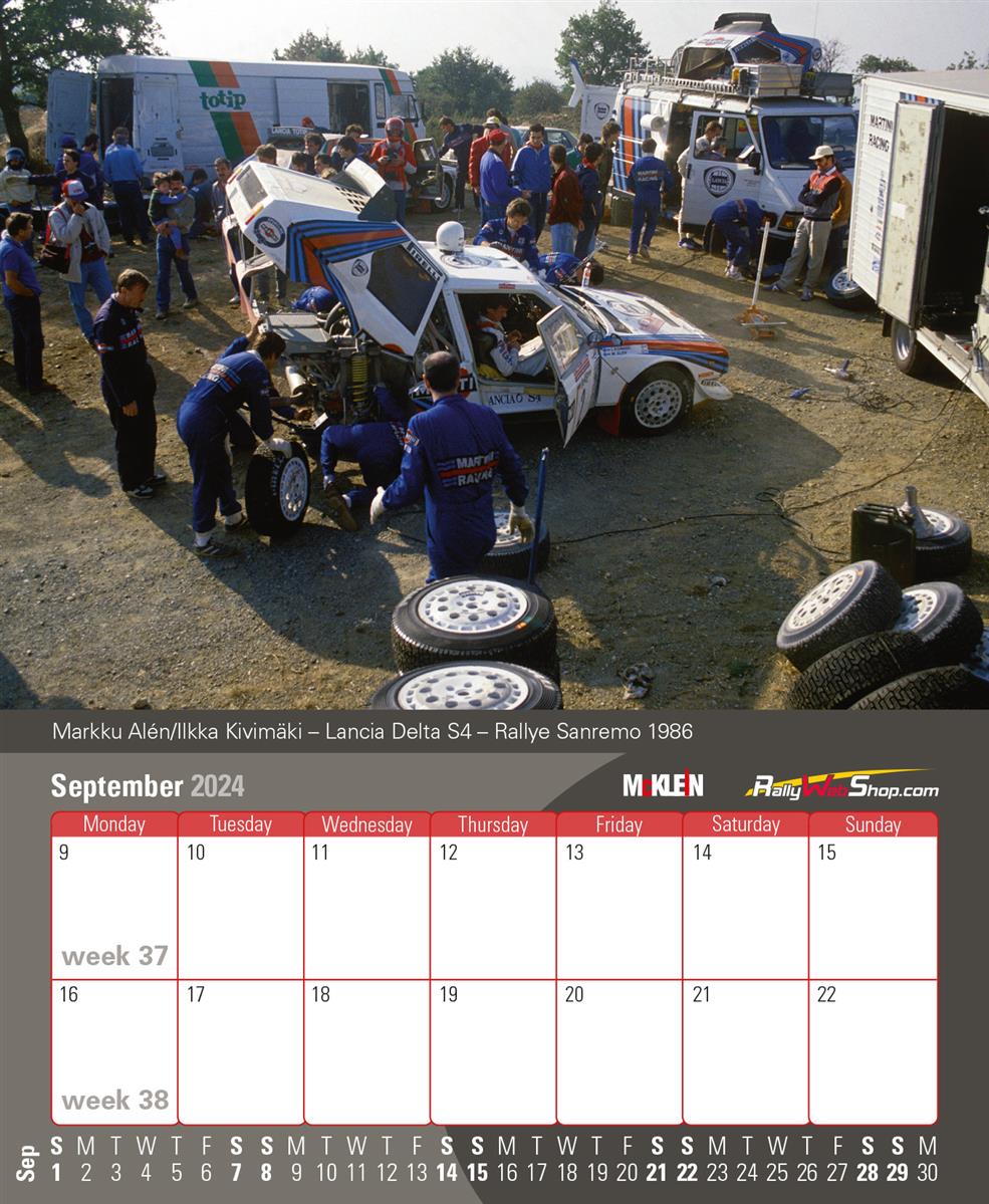 Το 2023, το Παγκόσμιο Πρωτάθλημα Ράλι είχε ηλικία μισού αιώνα, αλλά, όπως κάθε χρόνο, η έκδοση McKlein «Desktop Rally Calendar» 2024 προσφέρει τις καλύτερες φωτογραφίες από περισσότερα από πενήντα χρόνια συν δύο προηγούμενες δεκαετίες διεθνών ράλι. Όπως πάντα, κάθε δεκαπενθήμερο προσφέρει στον λάτρη του ράλι μια επιλογή μεταξύ κλασικού ή μοντέρνου. Τα δύο θέματα είναι εναλλάξιμα σε ελάχιστο χρόνο: ένα από το πολύχρωμο παρελθόν, ένα από την τελευταία σεζόν.