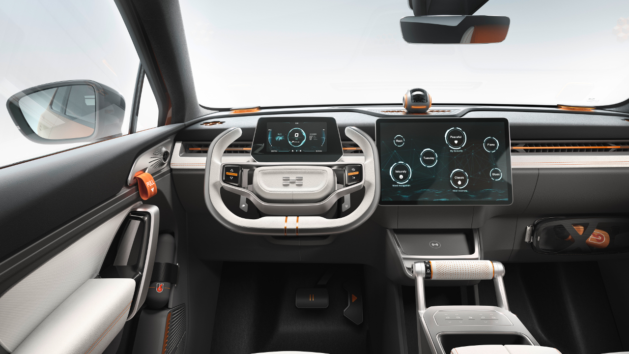 Στο εσωτερικό του το νέο concept της κινέζικης start up εταιρίας φάνταζει πιο φουτουριστικό και ο ανοιχτόχρωμος χρωματικός συνδυασμός το κάνει ευχάριστο στο μάτι. Ο οδηγός πληροφορείται από μία οθόνη με διαγώνιο στις επτά ίντσες, ενώ εντύπωση προκαλεί το χειριστήριο στην κεντρική κονσόλα, πάνω στο οποίο ενσωματώνεται και ο περιστροφικός διακόπτης για την επιλογή λειτουργίας του αυτόματου κιβωτίου. Η έμπνευση για τον σχεδιασμό του προέρχεται από τα ταχύπλοα σκάφη και προσδίδει τον δικό του ιδιαίτερο τόνο.