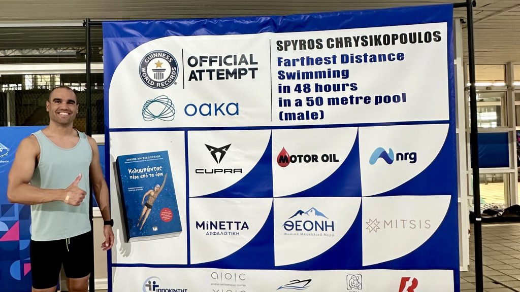 Και ο τίτλος αυτού: «Η μεγαλύτερη κολυμβητική απόσταση σε 48 ώρες σε πισίνα 50μ.». Ο κορυφαίος Έλληνας κολυμβητής υπέρ-αποστάσεων Σπύρος Χρυσικόπουλος επέστρεψε κάνοντας Παγκόσμιο ρεκόρ κολύμβησης σε 48 ώρες. Η προσπάθεια ξεκίνησε την Παρασκευή 18 Ιουλίου στις 12:00 και ολοκληρώθηκε την Κυριακή 20 Ιουλίου στις 12:00 στην εσωτερική πισίνα 50 μέτρων του Ο.Α.Κ.Α. Ο Σπύρος κολύμπησε συνολικά 151χλμ. ενώ έμεινε άυπνος για πάνω από 48 ώρες.