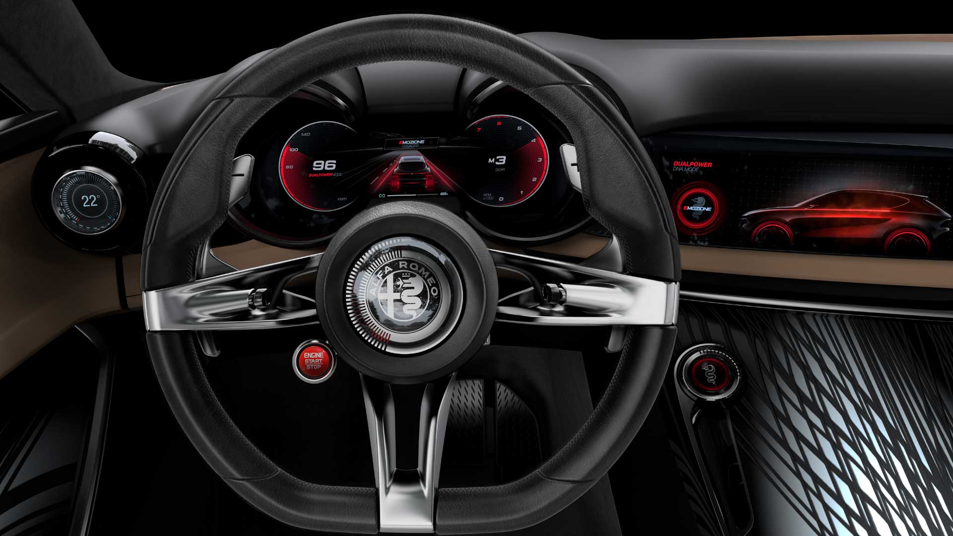 Σύγχρονο και δυναμικό όμως είναι και το εσωτερικό της Tonale. Σε αυτό παρατηρούμε ψηφιακά, στρογγυλά όργανα στον πίνακα οργάνων, οθόνη αφής στο κέντρο του ταμπλό, τριάκτινο τιμόνι με το button εκκίνησης επάνω του, κυκλικούς αεραγωγούς με οθόνη ένδειξης θερμοκρασίας, ενώ ο επιλογέας ταχυτήτων λάμπει δια της απουσίας του.
