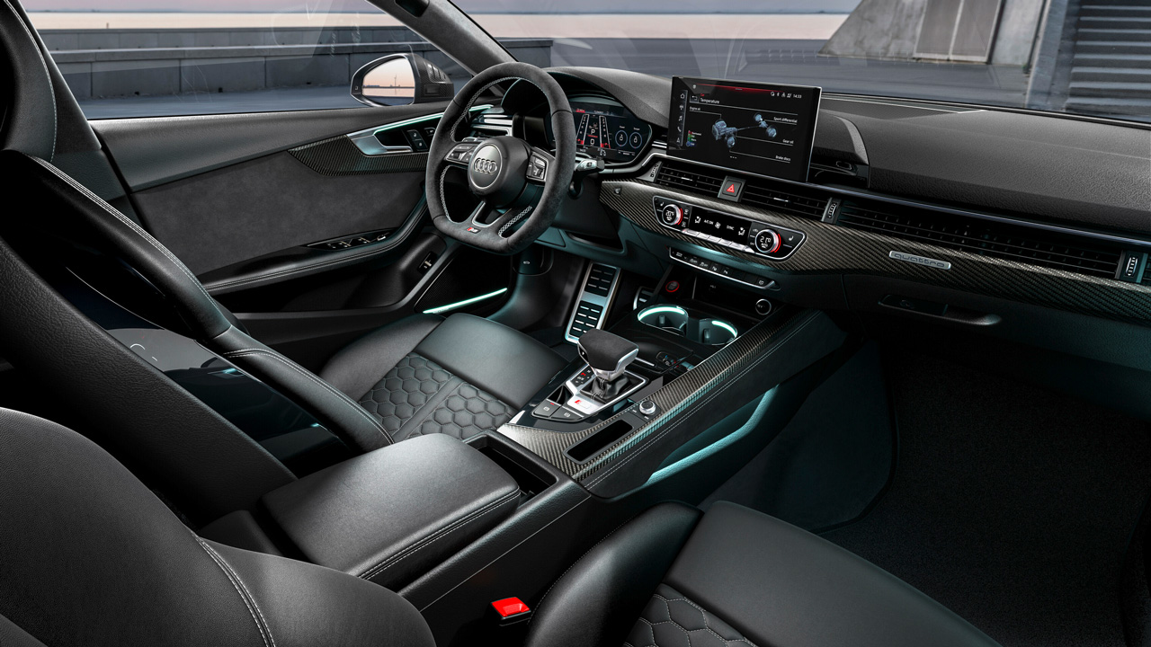 Ξεκινώντας από την εξωτερική εμφάνιση, οι εκδόσεις Audi RS Competition ξεχωρίζουν από τα λογότυπα της εταιρείας εμπρός και πίσω, τα οποία είναι βαμμένα με μαύρο χρώμα. Μιας και αναφερθήκαμε σε χρωματικές αλλαγές, μόνο γι’ αυτή την έκδοση είναι διαθέσιμο και το “Sebring Black” χρώμα. Στον προαιρετικό εξοπλισμό του Competition Pack υπάρχουν και οι ζάντες 20 ιντσών Phantom Black, οι οποίες μπορούν να συνδυαστούν με ελαστικά επιδόσεων Pirelli P Zero Corsa. Οι αλλαγές ολοκληρώνονται με carbon κομμάτια στο κάτω μέρος του αμαξώματος, όπως για παράδειγμα ο διαχύτης και τα πλαϊνά μαρσπιέ. Όσο για το εσωτερικό, εκεί συναντάμε επίσης carbon λεπτομέρειες, αλλά και καθίσματα υπενδεδυμένα με Pearl Nappa δέρμα.