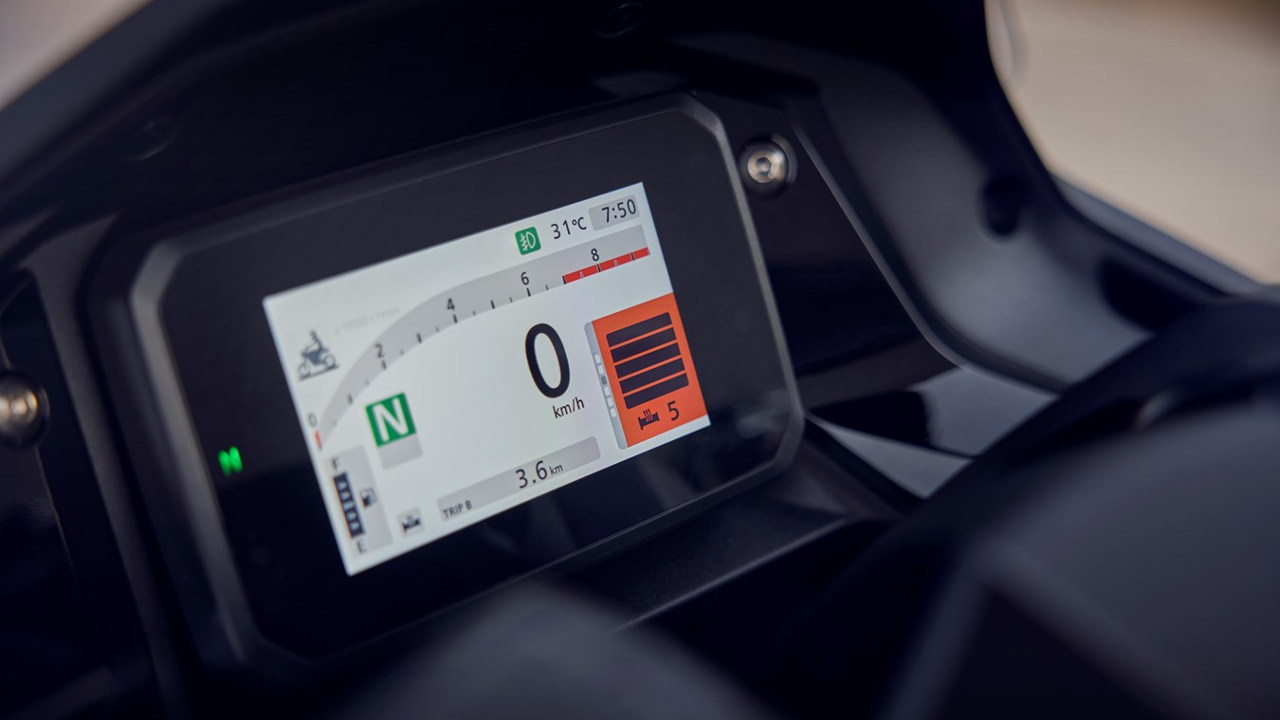 Οι αλλαγές για τη βελτίωση της άνεσης και της εργονομίας συνεχίζονται με τη μεταφορά της θύρας USB-C στο τιμόνι -ήταν κάτω από τη σέλα- την αναβαθμισμένη TFT οθόνη με τη διαγώνιο των πέντε ιντσών που συνδέεται και με κινητό αλλά και το cruise control που ανήκει πλέον μέρος του βασικού εξοπλισμού, όπως και το νέο χειριστήριο της ιαπωνικής εταιρείας στο αριστερό γκριπ που ελέγχει τις ενδείξεις του πίνακα πληροφοριών.