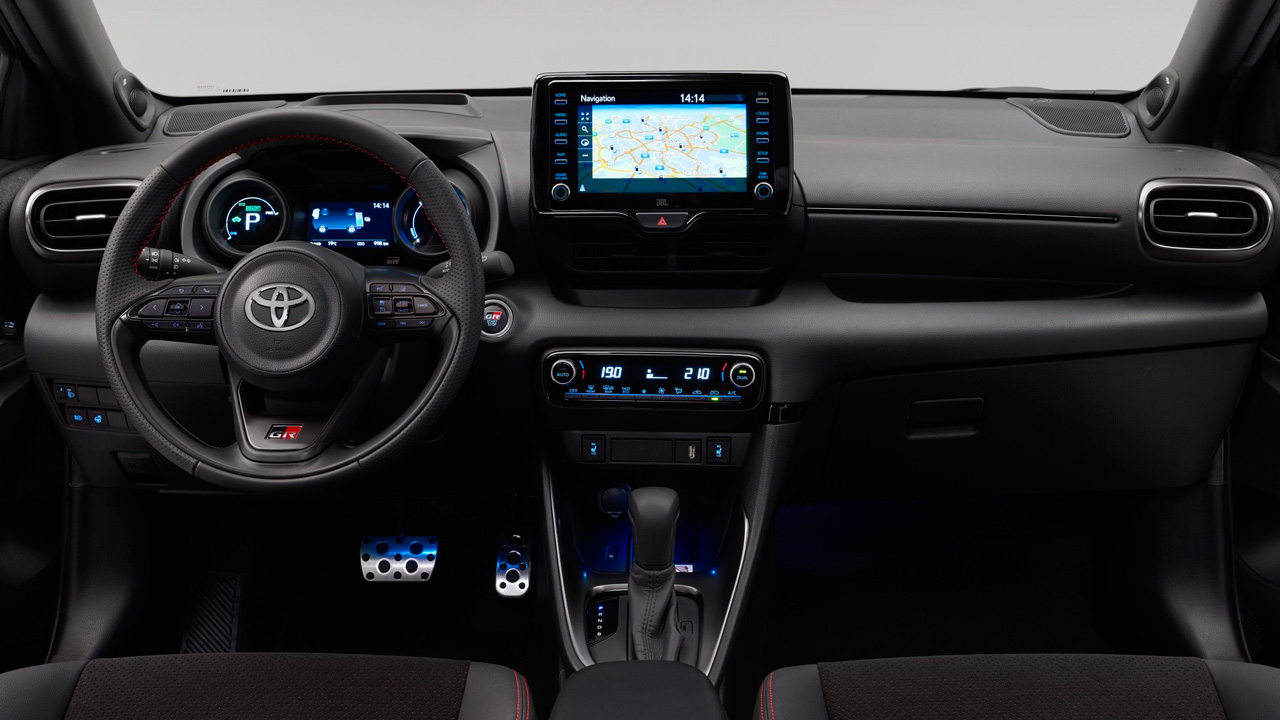 Περνάμε στο εσωτερικό, εκεί που πάλι συναντάμε το ίδιο σήμα σε τιμόνι και προσκέφαλα. Άλλες σπορ λεπτομέρειες που κάνουν το Toyota Yaris GR Sport να ξεχωρίζει είναι μεταξύ άλλων οι κόκκινες ραφές και τα αλουμινένια πεντάλ.