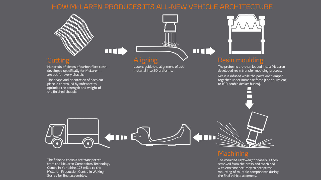 Το νέο πλαίσιο εξολοκλήρου από ανθρακονήματα και κατασκευασμένο με τεχνικές της ίδιας της McLaren εξελίχθηκε στο κέντρο των Βρετανών McLaren Composites Technology Centre (MCTC), το οποίο βρίσκεται στο Shefield της Αγγλίας. Εκεί θα κατασκευάζεται και έπειτα θα μεταφέρεται στο Woking, μέσα στο καλούπι του, όπου θα γίνεται η τελική κατεργασία του με επόμενο βήμα τη συναρμολόγηση. Τα βήματα για τη δημιουργία του που περιλαμβάνει ευθυγράμμιση μεταξύ των υφασμάτων από ανθρακονήματα με τη βοήθεια lazer μπορείτε να τα δείτε παραστατικά στην ακόλουθη εικόνα.