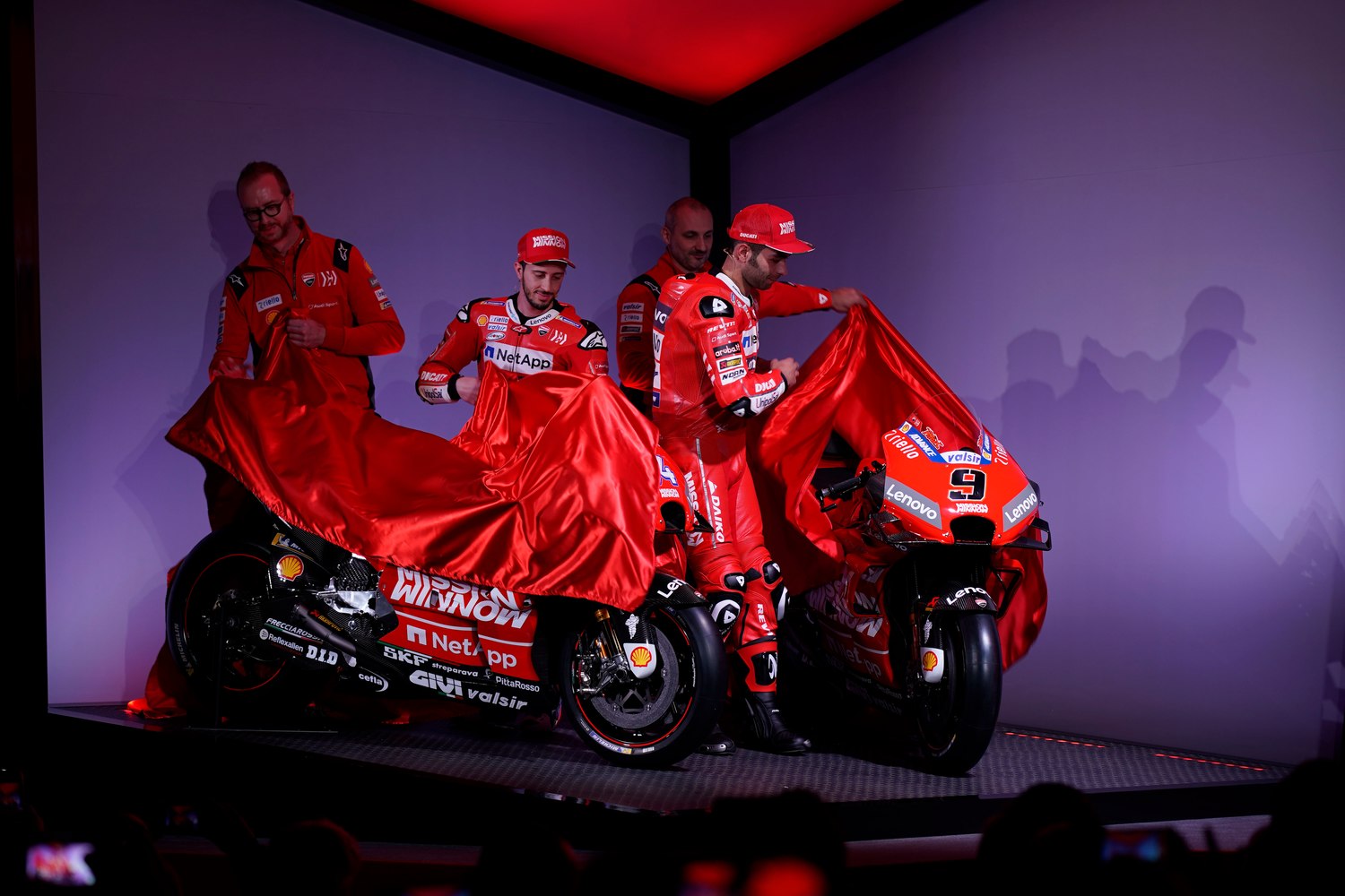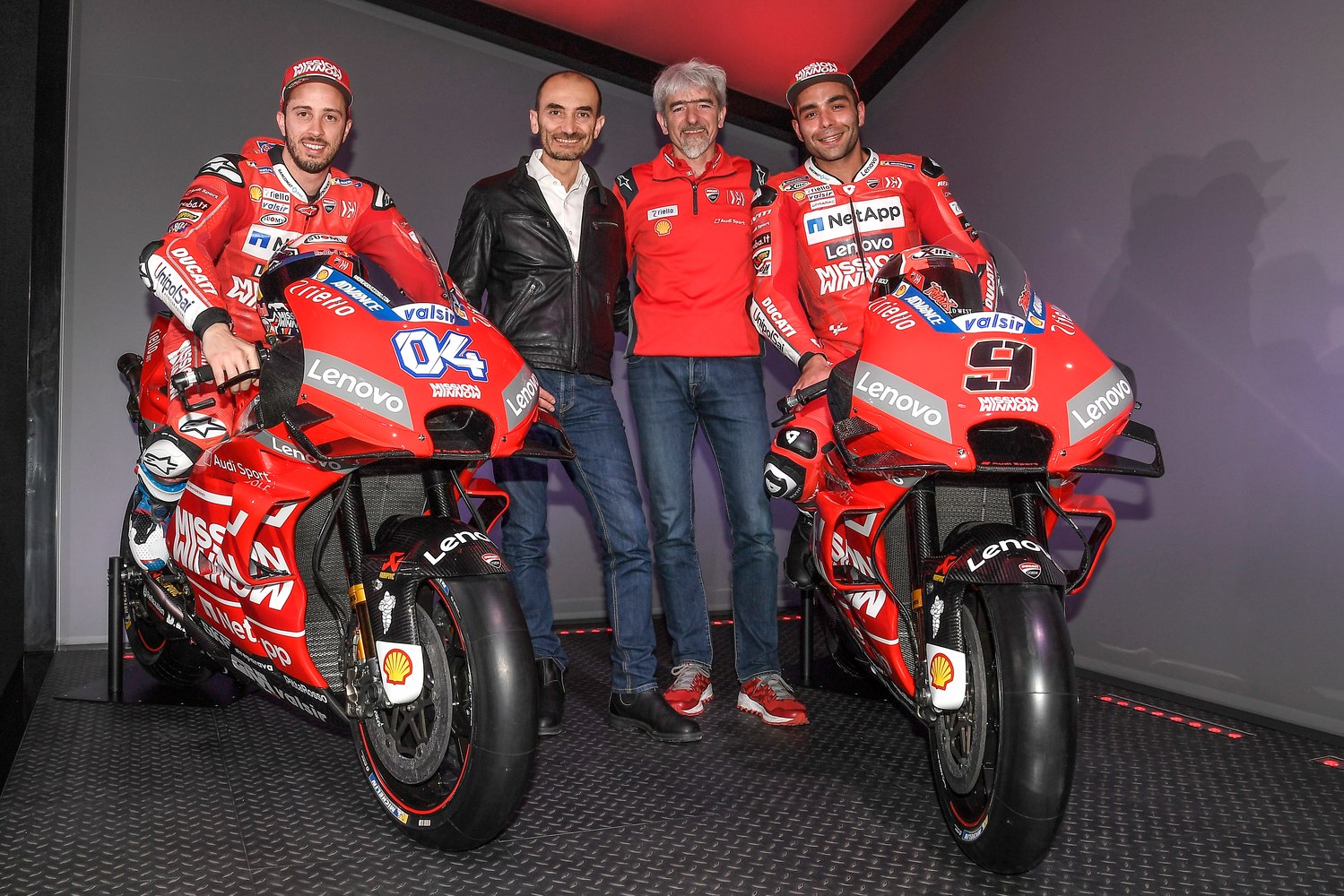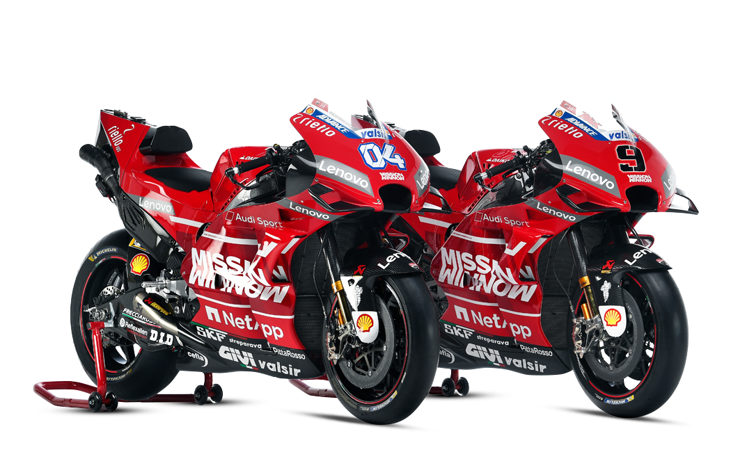 Στη σέλα των αγωνιστικών Ducati θα καθίσουν οι Andrea Dovizioso και Danilo Petrucci, ενώ αυτό που έκανε εντύπωση ήταν η ονομασία της αγωνιστικής ομάδας η οποία είναι “Mission Winnow Ducati team” (υπάρχει και στην ομάδα F1 της Ferrari) αλλά και το κατακόκκινο χρώμα όλης της ομάδας. Όσον αφορά τις μοτοσυκλέτες, αυτές δεν απέχουν πολύ σε εμφάνιση από της περσινής χρονιάς, έχοντας όμως ακόμη μεγαλύτερη προσοχή στις αεροδυναμικές λεπτομέρειες, κάτι που φαίνεται και στο εμπρός μέρος.
