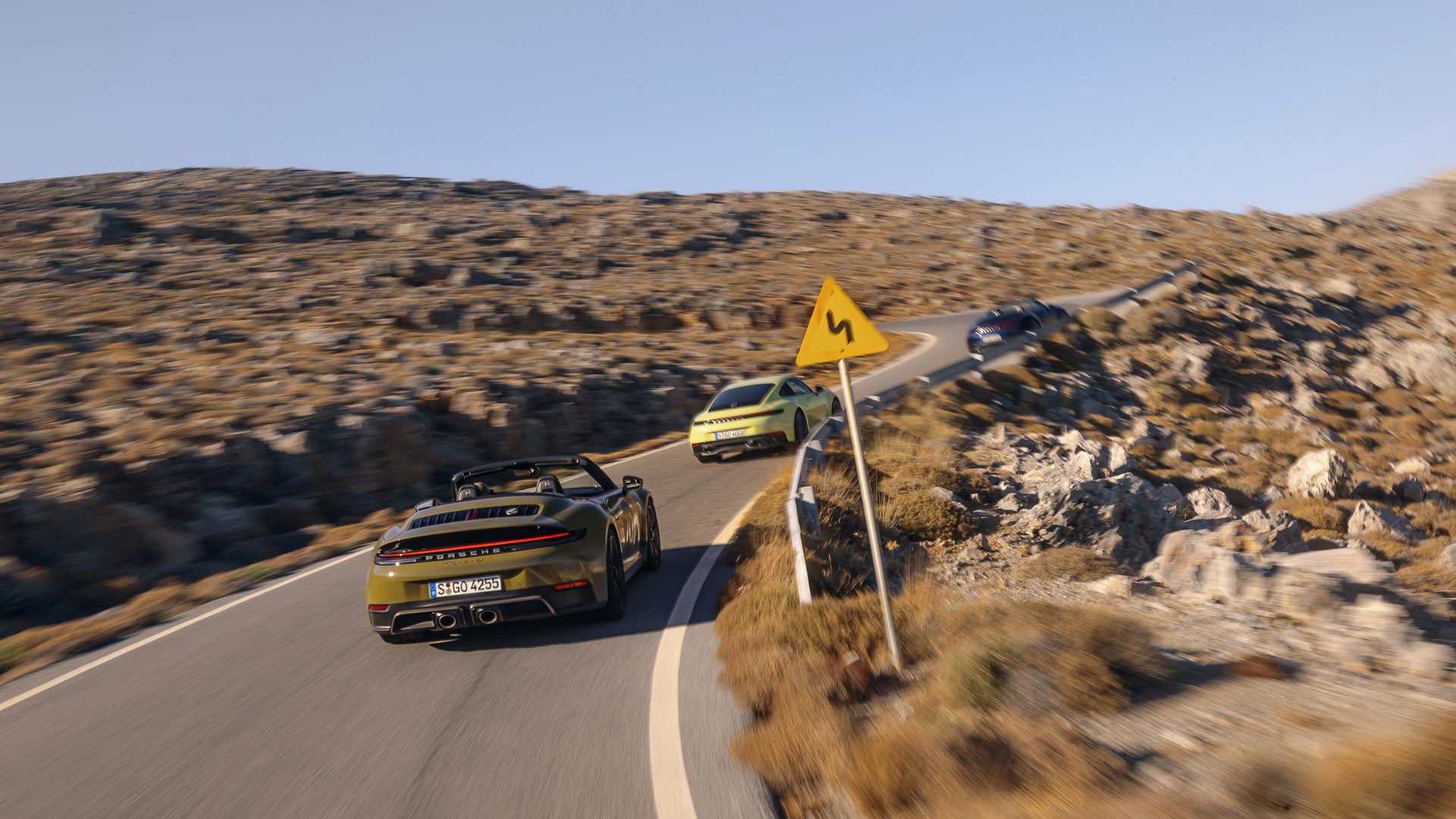 Η πρώτη οδηγική επαφή με την ανανεωμένη 911 έγινε στην έκδοση “Targa 4 GTS”, σε μία διαδρομή πέριξ της Σητείας. Μάλιστα, στην προγραμματισμένη διαδρομή περιλαμβανόταν ένα κομμάτι με αρκετές στροφές, ώστε το γερμανικό μοντέλο να “ξεδιπλώσει” τις αρετές του. Ξεκινάμε ασφαλώς από το υβριδικό σύστημα, το οποίο “συνεργάζεται” εξαιρετικά με το κιβώτιο PDK. Ειδικά στο πρόγραμμα “Sport+” (υπάρχουν συνολικά τέσσερα Drive Modes), η αντίδραση στις εντολές του οδηγού είναι ακαριαία. Το υβριδικό σύστημα προσφέρει άπλετη ροπή και το σημαντικότερο… είναι διαθέσιμη από πολύ χαμηλές στροφές! Το σύστημα διεύθυνσης εξακολουθεί να αποτελεί ένα από τα πιο “δυνατά” στοιχεία της Porsche 911 και εδώ αξίζει να σημειώσω τα πλεονεκτήματα που προσφέρει το σύστημα τετραδιεύθυνσης του γερμανικού μοντέλου, το οποίο βρίσκεται στον στάνταρ εξοπλισμό. Σε χαμηλές ταχύτητες, οι πίσω τροχοί στρίβουν αντίθετα από τους μπροστινούς, κάνοντας το αυτοκίνητο πιο ευέλικτο, ενώ σε υψηλότερες ταχύτητες στρίβουν προς την ίδια διεύθυνση αυξάνοντας σημαντικά την ευστάθεια.
