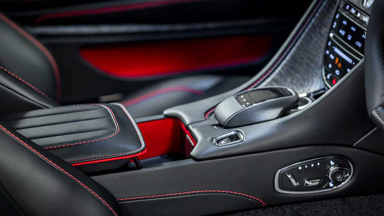 Στο εσωτερικό της επετειακής Aston Martin DBS Superleggera, το μαύρο χρώμα κυριαρχεί, ενώ υπάρχουν και κόκκινες λεπτομέρειες, όπως ακριβώς ήταν και το εσωτερικό του αυτοκινήτου που πρωταγωνίστησε στην ταινία.