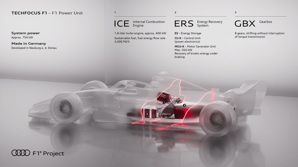 “Η ισχύς του συστήματος παραμένει κοντά στους 1.000 ίππους, όμως η κατανάλωση καυσίμου μειώνεται αισθητά”, σημειώνει ο Stefan Dreyer, ο οποίος ως Chief Technical Officer (CTO) είναι επικεφαλής στην ανάπτυξη της μονάδας ισχύος στην Audi Formula Racing GmbH στο Neuburg. Ο Dreyer εξηγεί περαιτέρω: “Οι νέοι τεχνικοί κανονισμοί εστιάζουν κυρίως στη διαχείριση της ενέργειας και αυξάνουν σημαντικά τη συμμετοχή της ηλεκτρικής ισχύος. Για τους κινητήρες εσωτερικής καύσης, πλέον δεν θα συζητάμε για τη μέγιστη ποσότητα καυσίμου που καταναλώνεται ανά ώρα σε κιλά, αλλά για τη μέγιστη ροή ενέργειας καυσίμου ανά ώρα, η οποία μετριέται σε μεγατζάουλ (MJ/h). Από το 2026, αυτή η τιμή θα μειωθεί κατά περίπου 30%, φτάνοντας στα 3.000 MJ/h. Τη μείωση αυτή αντισταθμίζει η αυξημένη ηλεκτρική ενέργεια, καθώς η νέα, ισχυρότερη μονάδα MGU-K επιτρέπει την ανάκτηση πολύ περισσότερης ενέργειας κατά το φρενάρισμα.”