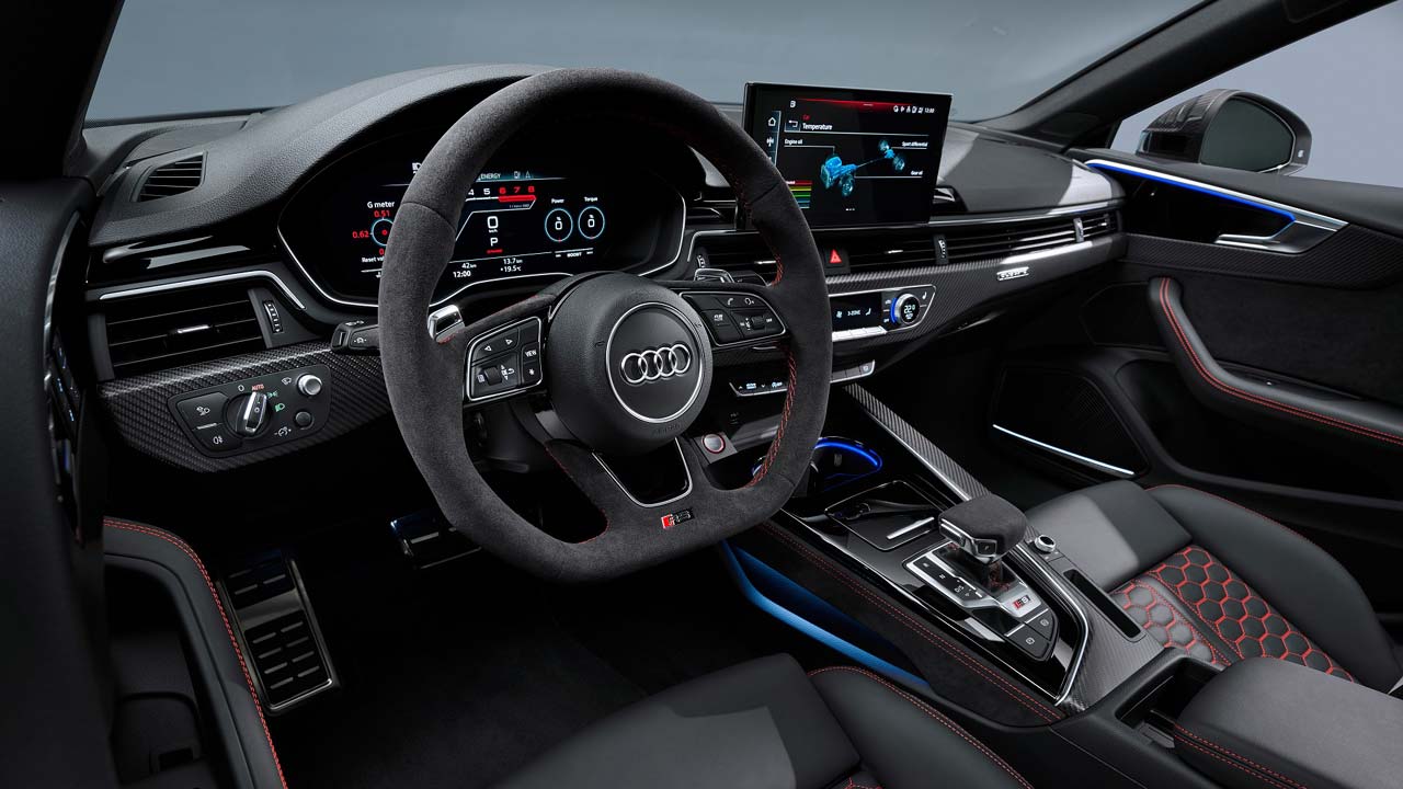 Η ψηφοποίηση στην καμπίνα και αυτού του μοντέλου της Audi είναι… ολοκληρωτική. Το νέο μοντέλο λειτουργίας των δύο μοντέλων RS 5 επικεντρώνεται στην οθόνη αφής MMI 10,1 ιντσών. Αν το αυτοκίνητο εφοδιάζεται με το σύστημα πλοήγησης MMI navigation plus, μια συγκεκριμένη οθόνη RS παρέχει στον οδηγό πληροφορίες σχετικά με τη θερμοκρασία οδήγησης, τη διαμήκη και πλευρική επιτάχυνση, το σπορ διαφορικό quattro, την πίεση ελαστικών και τη θερμοκρασία ελαστικών.