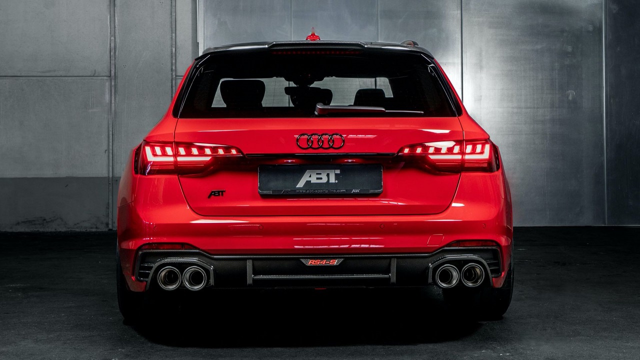 Οι εξωτερικές βελτιώσεις είναι σχετικά διακριτικές, όπως αρμόζει σε ένα μοντέλο με τον χαρακτήρα του Audi RS4 Avant. Κάτω από τον εμπρός προφυλακτήρα υπάρχει ένα splitter κατασκευασμένο από ανθρακονήματα. Το ίδιο συμβαίνει και στα υπόλοιπα πρόσθετα μέρη, όπως για παράδειγμα τον διαχύτη και την αεροτομή. Η αναβάθμιση ολοκληρώνεται με τις νέες ζάντες 21 ιντσών που σχεδιάστηκαν “in house” από την ABT, τα ελατήρια χαμηλώματος και τις δύο διπλές απολήξεις στο πίσω μέρος.
