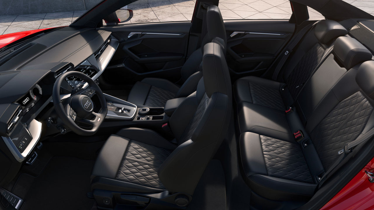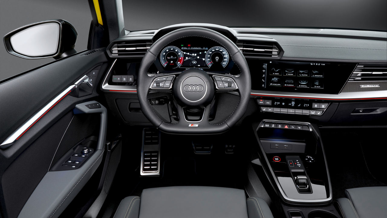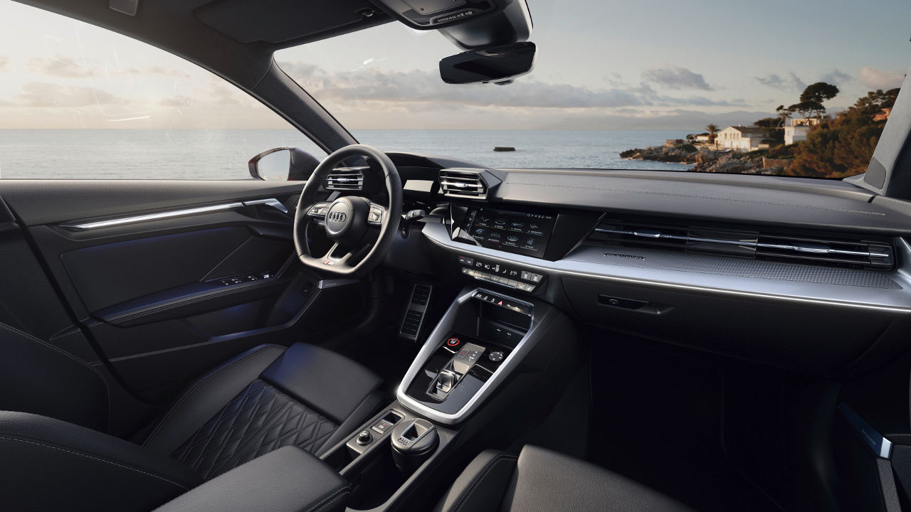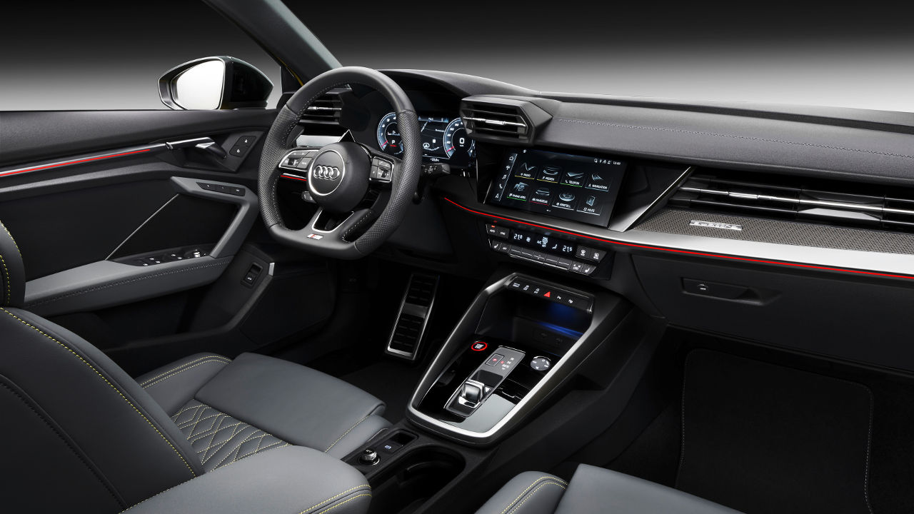 Τόσο ως Sportback όσο και σαν sedan το νέο Audi S3 ξεχωρίζει για την επιθετική σχεδίαση του αμαξώματος του που χαρακτηρίζεται από έντονες καμπύλες αλλά και ακμές. Η μαύρη κυψελωτή γρίλια κυριαρχεί στο εμπρός μέρος, όπως και οι μεγάλοι αεραγωγοί του προφυλακτήρα με το εμπρός μέρος να γίνεται ακόμη πιο εντυπωσιακό με την προσθήκη των έξτρα matrix LED φωτιστικών σωμάτων. Αντίστοιχα σπορτίφ είναι και η εικόνα στο προσεγμένο σκουρόχρωμο εσωτερικό. Ο πίνακας πληροφοριών του οδηγού έχει διαγώνιο 10,25 ίντσες με εκείνη για την οθόνη αφής να φτάνει στις 10,1 ίντσες. Διαθέσιμη είναι αναβάθμιση και για τα δύο στις 12,3 ίντσες.