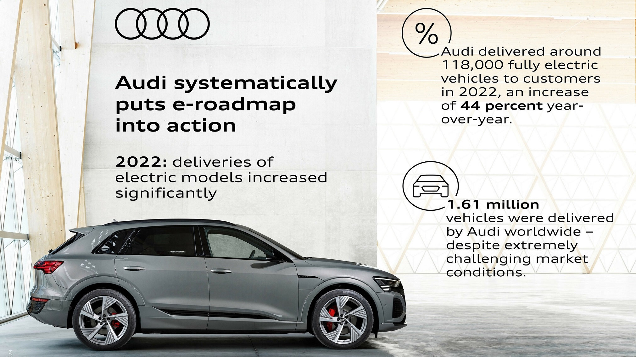 “Οι μεγάλες πωλήσεις για τα αμιγώς ηλεκτρικά μοντέλα μας δείχνουν ότι η ξεκάθαρη αφοσίωσή μας στην μετακίνηση είναι ο σωστός δρόμος”, δήλωσε η Hildegard Wortmann, μέλος του δ.σ. της Audi, για τις Πωλήσεις και το Μάρκετινγκ. Συνολικά, οι Γερμανοί παρέδωσαν 118.196 ηλεκτρικά μοντέλα στους πελάτες τους το 2022, δηλαδή 42,8% περισσότερα από το 2021.