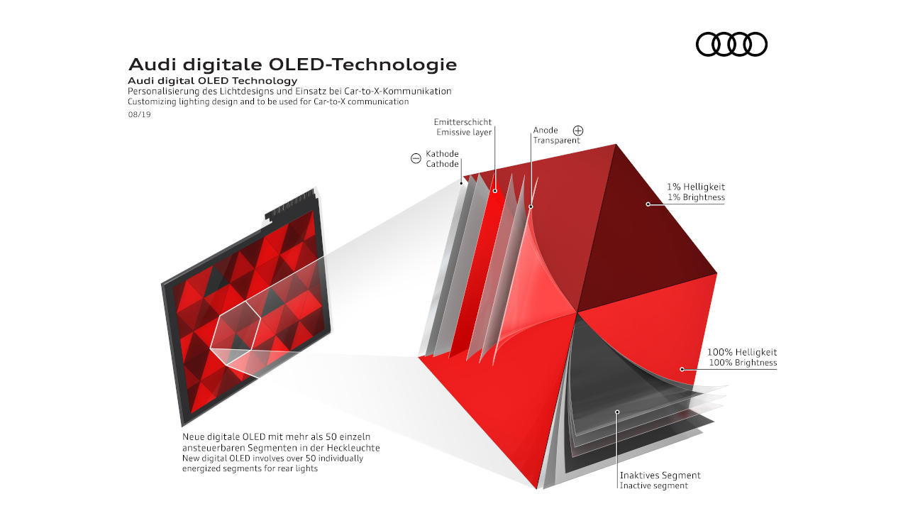 Οι πηγές φωτός OLED βασίζονται ως πάνελ, σε αντίθεση με τα LED τα οποία εκπέμπουν φως σημειακά. Σύμφωνα με την Audi, η αρχή λειτουργίας των OLED, ως ολιστική φωτεινή πηγή και όχι εκπομπή φωτός από επιμέρους σημεία, έχει πολλαπλά οφέλη: το φως των OLED είναι εξαιρετικά ομοιογενές, απεριόριστα ρυθμιζόμενο και επιτυγχάνει πολύ υψηλή αντίθεση. Επιπλέον, μπορεί να κατατμηθεί, με τα τμήματα αυτά να ελέγχονται ξεχωριστά και να μπορούν να αναπτύξουν διαφορετικά επίπεδα φωτεινότητας, με ελάχιστα κενά μεταξύ τους. Μιας και μιλάμε για πίσω φωτιστικά σώματα, η κάθε φωτιστική μονάδα δεν απαιτεί ανακλαστήρες, οπτικές ίνες ή παρόμοια οπτικά. Αυτό καθιστά τις μονάδες OLED πολύ αποδοτικές, ελαφριές και επίπεδες, γεγονός που αυξάνει σημαντικά την ελευθερία έκφρασης των σχεδιαστών.