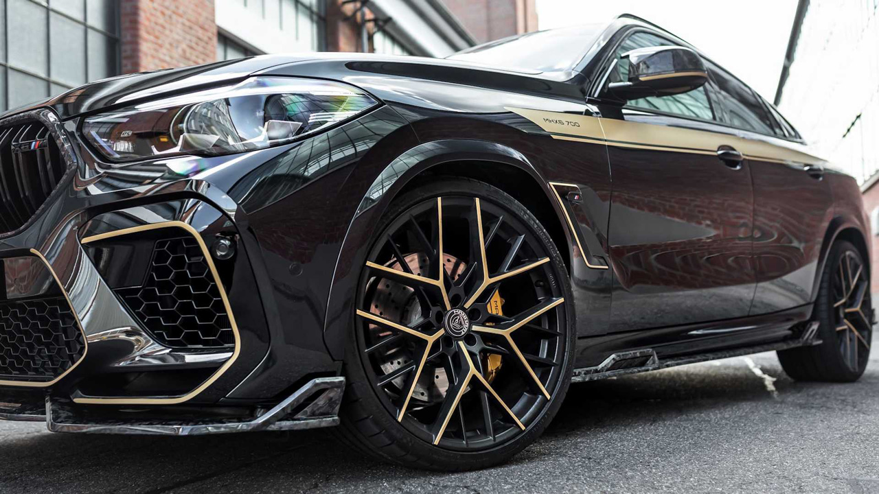 Ξεκινάμε από την εξωτερική μεταμόρφωση, με την BMW X6 M Competition να εξοπλίζεται με ένα carbon bodykit που αποτελείται από εμπρός splitter, πλαϊνές ποδιές, διαχύτη και αεροτομή στο πίσω μέρος. Ασφαλώς, δεν απουσιάζουν και τα χαρακτηριστικά αυτοκόλλητα του οίκου με τις χρυσαφί λεπτομέρειες που διατρέχουν όλο το αμάξωμα.