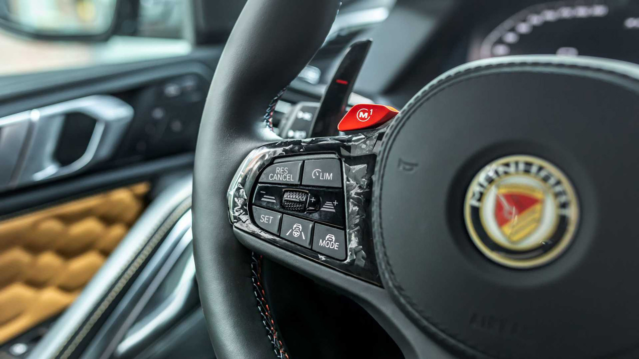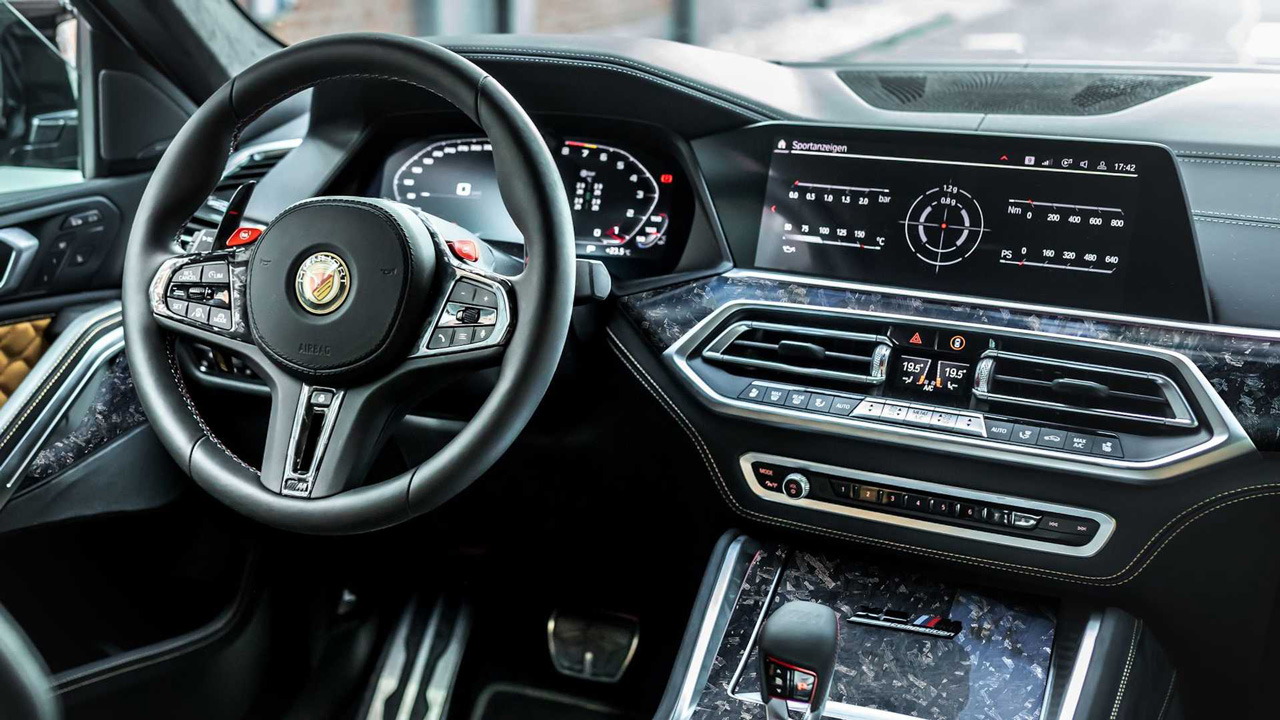 Στο εσωτερικό, όπως μπορείτε να δείτε έχουν τοποθετηθεί επίσης carbon κομμάτια στην κονσόλα, τις πόρτες, τις πλάτες των καθισμάτων και το τιμόνι. Ακόμα και τα paddles είναι carbon ώστε να διαφοροποιούνται από αυτά της εργοστασιακής BMW X6 M Competition.