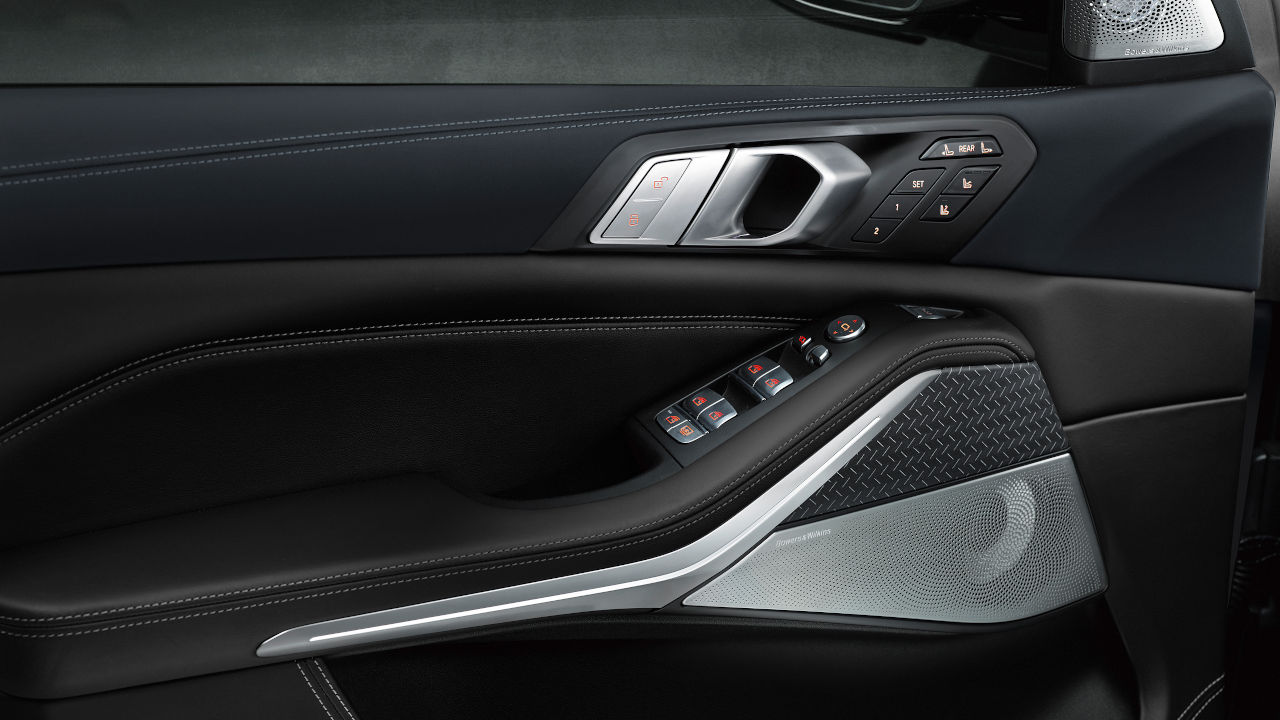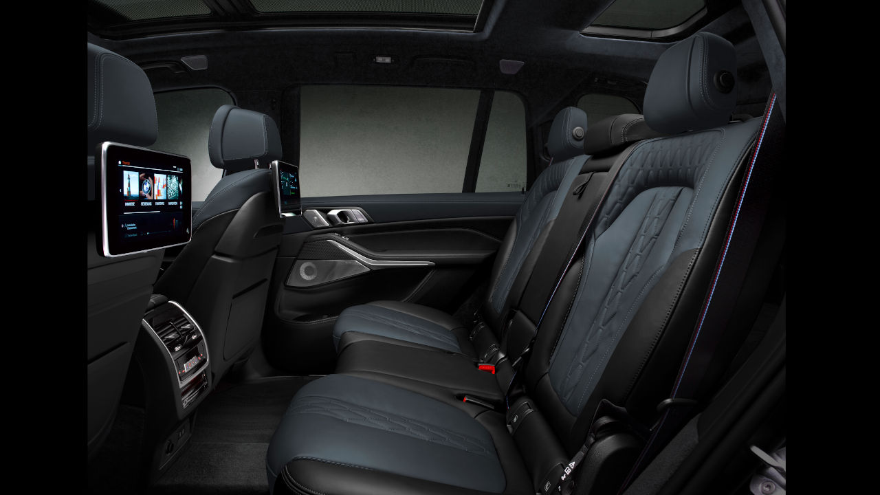Οι χρωματικές και εξοπλιστικές αλλαγές συνεχίζονται και το εσωτερικό του μεγάλου SUV με περισσότερα στοιχεία Individual, όπως είναι η πλήρως δερμάτινη επένδυση Merino σε δίχρωμο φινίρισμα Night Blue/Black με αντίθετες ραφές και η επένδυση οροφής BMW Individual από Αλκαντάρα σε σκούρο μπλε χρώμα. Το πάνω τμήμα του ταμπλό και τα υποβραχιόνια των θυρών φέρουν δερμάτινη επένδυση nappa επίσης σε σκούρο μπλε.