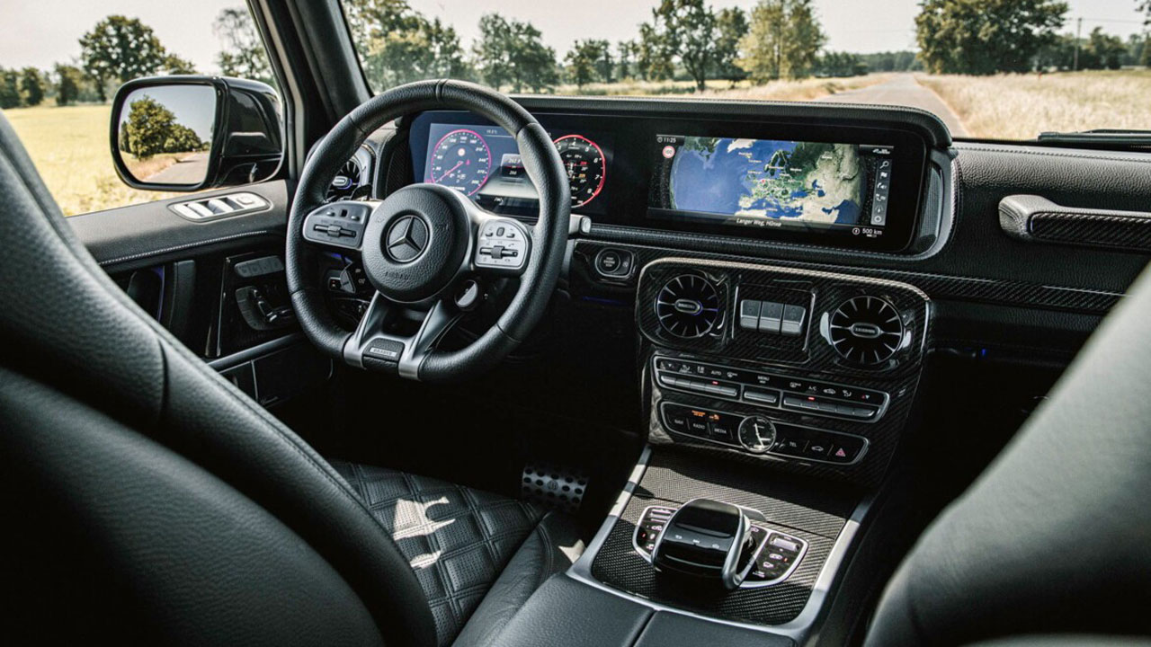 Εννοείται πως υπάρχουν τροποποιήσεις και στο εσωτερικό, με αρκετές επιφάνειες να καλύπτονται από δέρμα τύπου alcantara και carbon. Τα καθίσματα, το τιμόνι και όχι μόνο φέρουν την υπογραφή της Brabus, ενώ αξιοσημείωτη αλλαγή είναι και η απεικόνιση του ταχύμετρου, το οποίο πλέον “τερματίζει” στα 300 χλμ./ώρα.