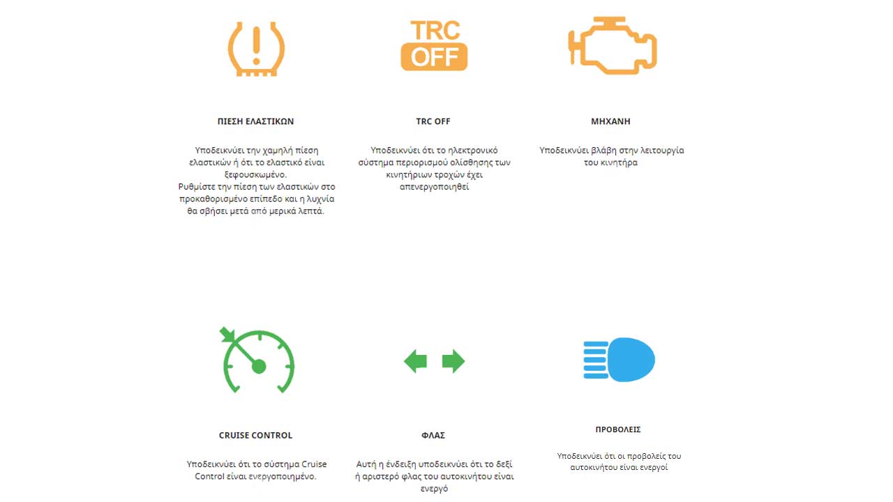 Στις εικόνες που ακολουθούν έχουμε τις εξής ενδεικτικές λυχνίες: Μπαταρία, Λιπαντικό, Αερόσακοι, Φρένα, ABS, Σύστημα διεύθυνσης, Καύσιμο, Αντιολισθητικά συστήματα, Πίεση ελαστικών, Σύστημα ελέγχου ευστάθειας, Κινητήρας, Cruise Control, Φλας, Προβολείς.