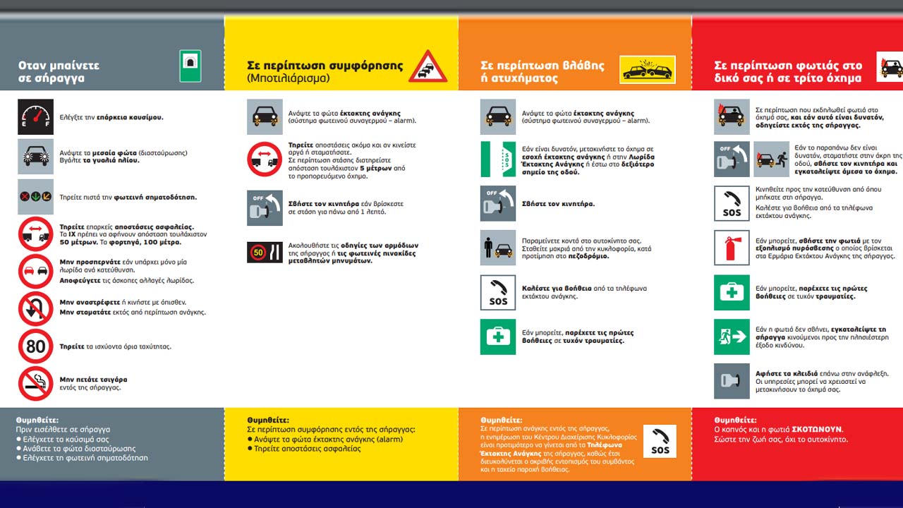 ΔΕΝ ΞΕΧΝΑΜΕ: Σε περίπτωση έκτακτης ανάγκης ενημερώνουμε άμεσα το Κέντρο Διαχείρισης Κυκλοφορίας μέσω των SOS τηλεφώνων ή καλούμε το 1075 μέσω του κινητού μας τηλεφώνου.