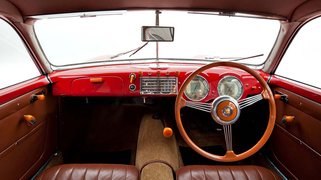 Πρωταγωνιστής το σπορ τριάκτινο τιμόνι με τις μεταλλικές ακτίνες του να πλαισιώνονται είτε από κοκάλινο, είτε από ξύλινο στεφάνι. Πίσω του ακριβώς βρίσκονταν δύο μεγάλα στρόγγυλα όργανα με νικελωμένα πλαίσια που έδιναν μία δυναμική πινελιά στο ξύλινο λουστραρισμένο κατακόκκινο ταμπλό, το οποίο κατέληγε σε ένα μικρό ντουλαπάκι μπροστά από το συνοδηγό. Κάτω από την κεντρική κονσόλα συναντούσε κανείς το τσοκ που έπρεπε ο οδηγός να τραβήξει για να εκκινήσει το αυτοκίνητο. Στο πάτωμα, κάτω από το ταμπλό, ξεκινούσε ο λεβιές ταχυτήτων που εκτείνονταν παράλληλα με το μεταξόνιο και κατέληγε σε ένα σφαιρικό μπουλ ξύλινο ή κοκάλινο αντίστοιχα.
