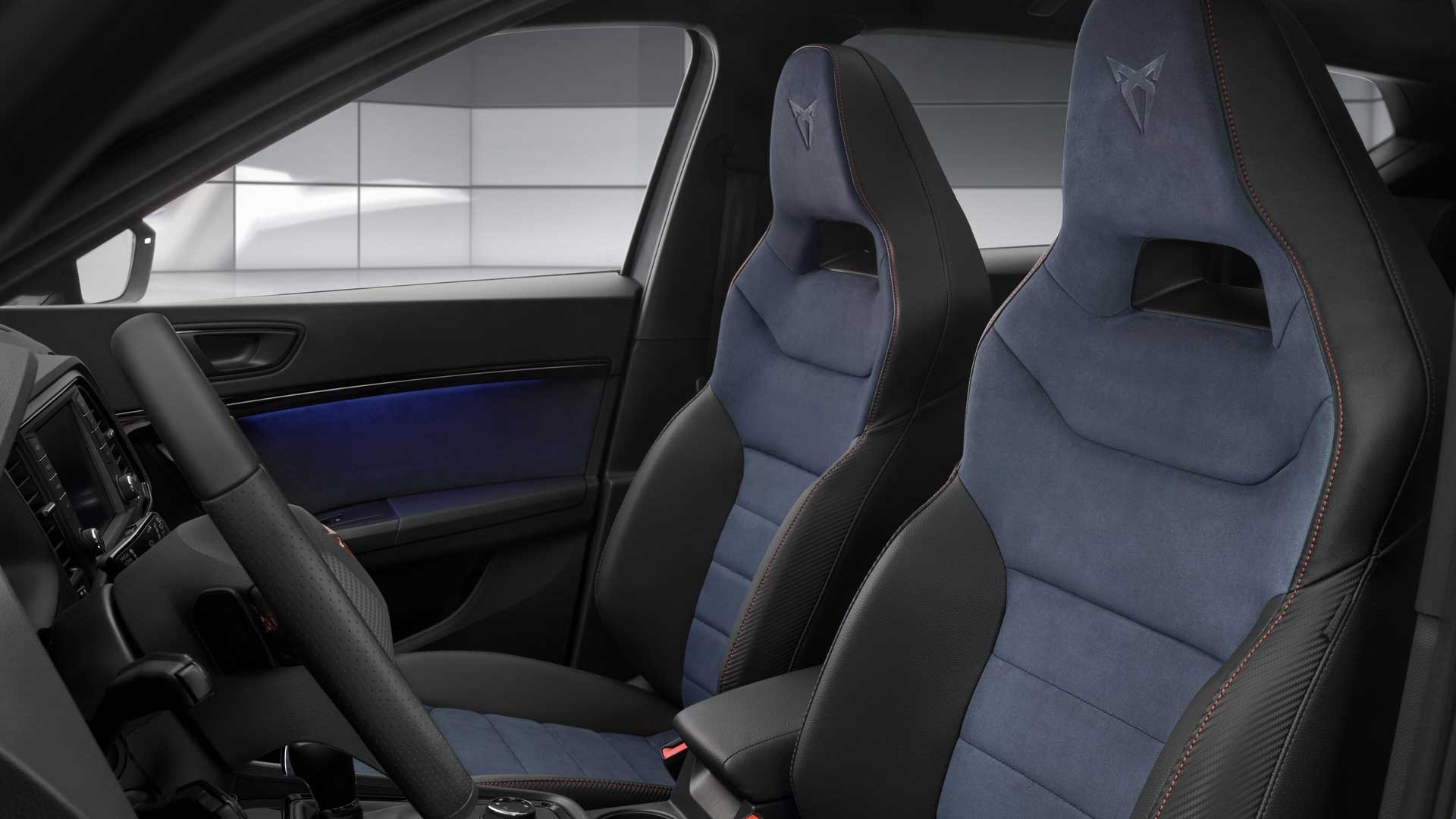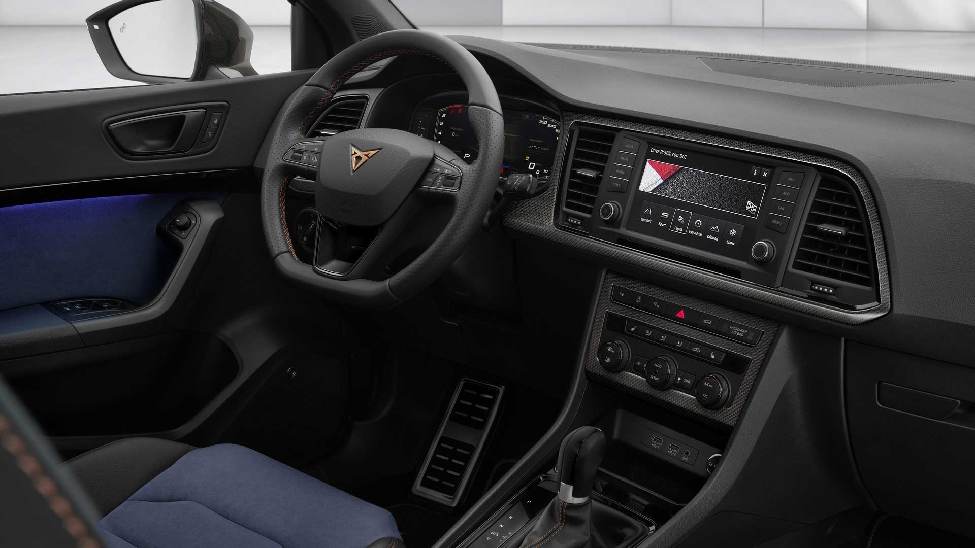 Στο εσωτερικό του, το Cupra Ateca Special Edition έχει να επιδείξει μπλε αλκαντάρα στο σαλόνι και στα πάνελ των θυρών, μπάκετ καθίσματα και σπορ δερμάτινο τιμόνι με επίπεδο κάτω μέρος.