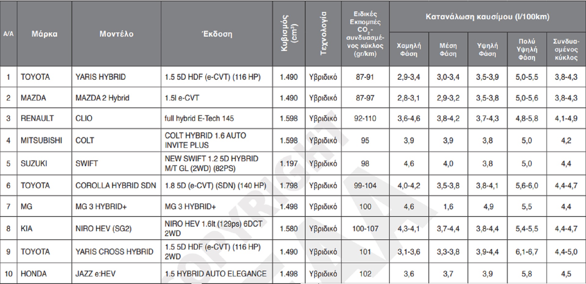 Όπως βλέπετε στον σχετικό πίνακα που ακολουθεί, το υβριδικό Toyota Yaris στην έκδοση με κινητήρα 1.5 5D HDF (e-CVT) είναι το υβριδικό μοντέλο με τους χαμηλότερους ρύπους (87-91 γρ./χλμ.) Εννοείται ότι ακριβώς η ίδια επίδοση ισχύει και στην περίπτωση του MAZDA 2 Hybrid, το οποίο αποτελεί ουσιαστικά “αδερφάκι” του. Η τριάδα ολοκληρώνεται με την πλήρως υβριδική έκδοση του Renault Clio. Ο λόγος για την έκδοση full hybrid E-Tech 145. Λίγο πιο πίσω ακολουθεί το Mitsubishi Colt, το οποίο αποτελεί “αδερφάκι” του Renault Clio και η πεντάδα ολοκληρώνεται με το Suzuki Swift. Το τελευταίο είναι το μοναδικό ήπια υβριδικό μοντέλο της πεντάδας… και ασφαλώς το φθηνότερο! Ακολουθούν τα δέκα υβριδικά με τους χαμηλότερους ρύπους, όπως ανακοινώνονται από τον ΣΕΑΑ.