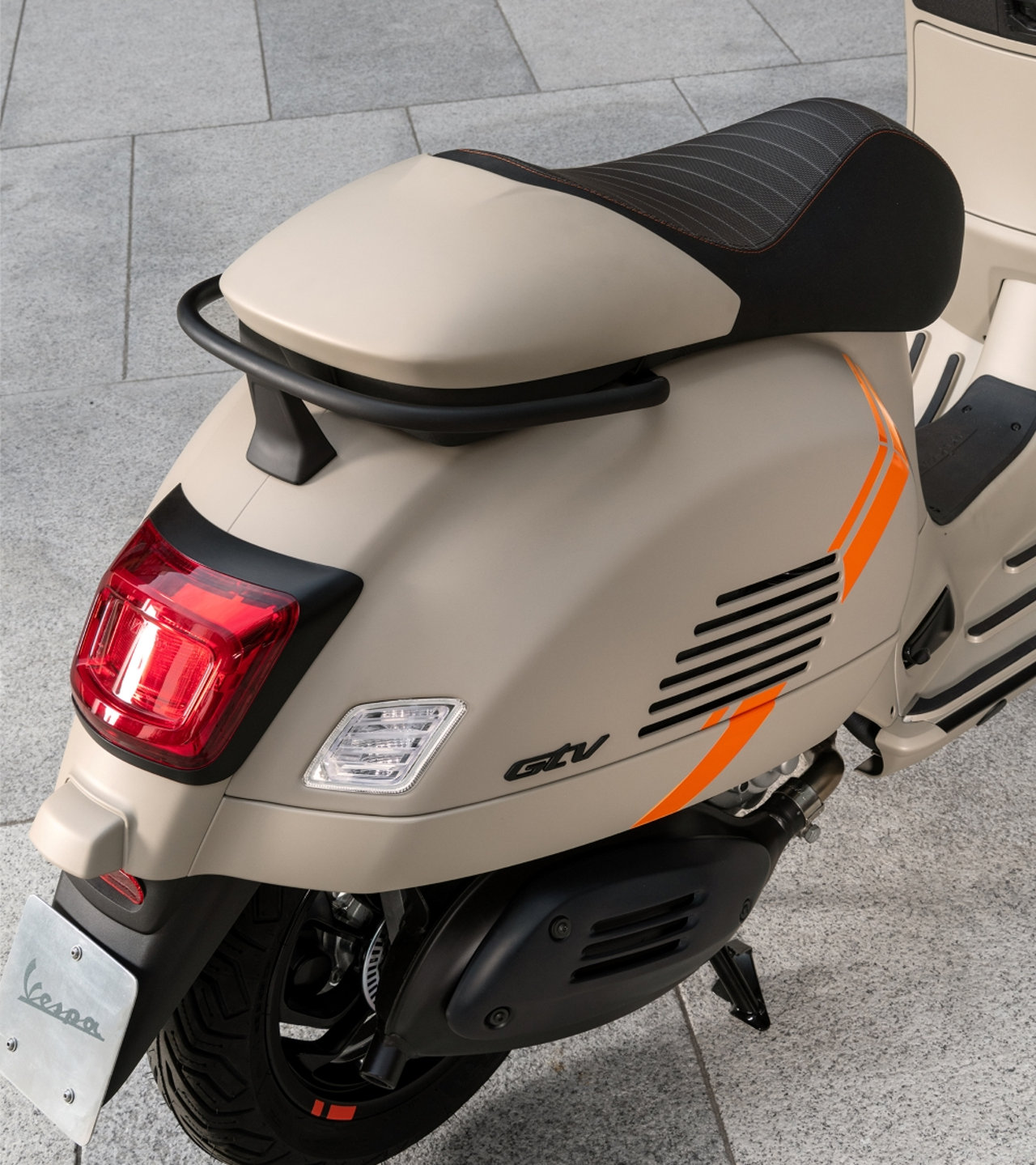 Ακόμα ένα χαρακτηριστικό στοιχείο της Gtv είναι η δίχρωμη μονοθέσια σέλα με racing εμφάνιση, ενώ στο πίσω μέρος μπορεί να τοποθετηθεί ένα σκληρό κάλυμμα στο χρώμα του αμαξώματος, μια αναφορά στα τυπικά φέρινγκ των αγωνιστικών Vespa. Το κάλυμμα διατίθεται ως ξεχωριστό αξεσουάρ και είναι αφαιρούμενο. Η σέλα είναι, ωστόσο, εγκεκριμένη ως διθέσια και χαρακτηρίζεται από ιδιαίτερο τεχνικό σχέδιο και οριζόντια θερμοκόλληση, πλαισιωμένη από αντίθετες πορτοκαλί ραφές.