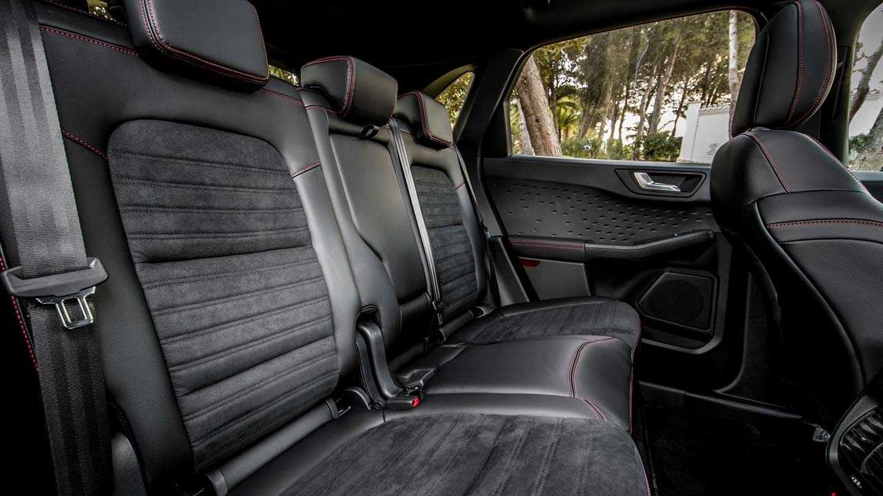 Περνάμε στο εσωτερικό, το οποίο είναι σύγχρονο… και άκρως ψηφιακό! Ο οδηγός μπορεί να χειρίζεται το SYNC 4 μέσω μιας οθόνης αφής 13,2 ιντσών. Η κεντρική οθόνη με οριζόντια διάταξη υποστηρίζεται από έναν νέο ψηφιακό πίνακα οργάνων TFT 12,3 ιντσών, ο οποίος είναι στάνταρ σε όλες τις εκδόσεις νέου Kuga. Όλες οι εκδόσεις του νέου Kuga διαθέτουν ασύρματο Apple CarPlay και Android Auto. Όσον αφορά τώρα στην πρακτικότητα, αξιοσημείωτο είναι ότι τα καθίσματα της δεύτερης σειράς μπορούν να μετακινούνται σε μια διαδρομή 140 χλστ., προσφέροντας από 395 έως 553 λίτρα στο χώρο αποσκευών (συρόμενα πίσω καθίσματα). Οι λύσεις πρακτικότητας συνεχίζονται και στην καμπίνα, με αρκετές θήκες για μικροαντικείμενα, μεγάλες “τσέπες” στις πόρτες και πρακτικές ποτηροθήκες. Ασφαλώς δεν απουσιάζει η θέση για ασύρματη φόρτιση, αλλά και οι θύρες USB για τους εμπρός και πίσω επιβάτες.